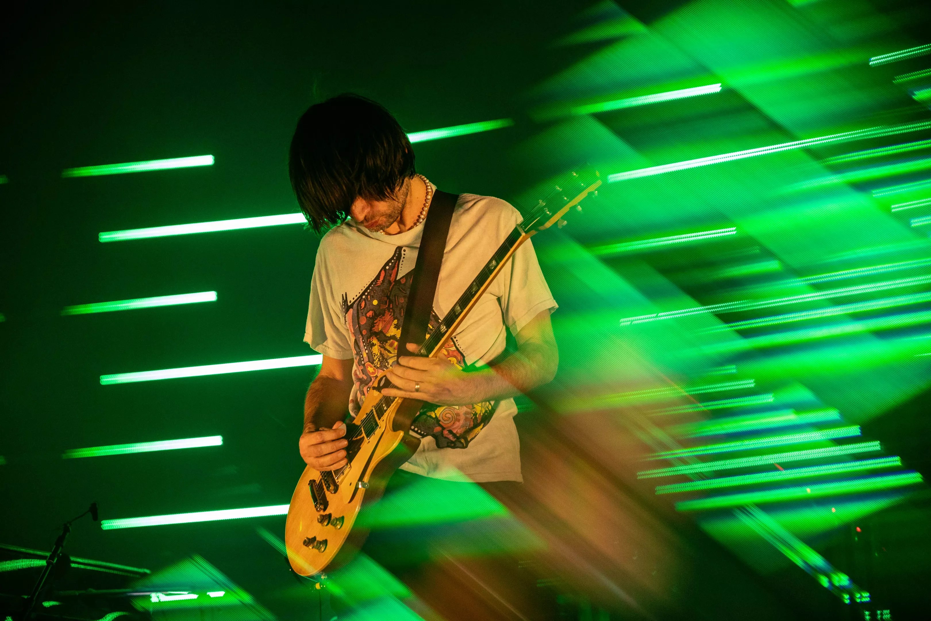 At 9:15 sharp, The Smile came out to a crowded and sweaty room. The use of red LED lights, mixed with the sound of Yorke’s familiar voice, brought the rowdy crowd into perfect silence. The band started with album opener “The Same” while scattered across the large stage; Greenwood was front and center on guitar while Yorke played and sang stage right, with drummer Skinner occupying the far left. As the band journeyed through the set, the lights set the mood, often reflecting off Greenwood’s Gold Gibson Les Paul.