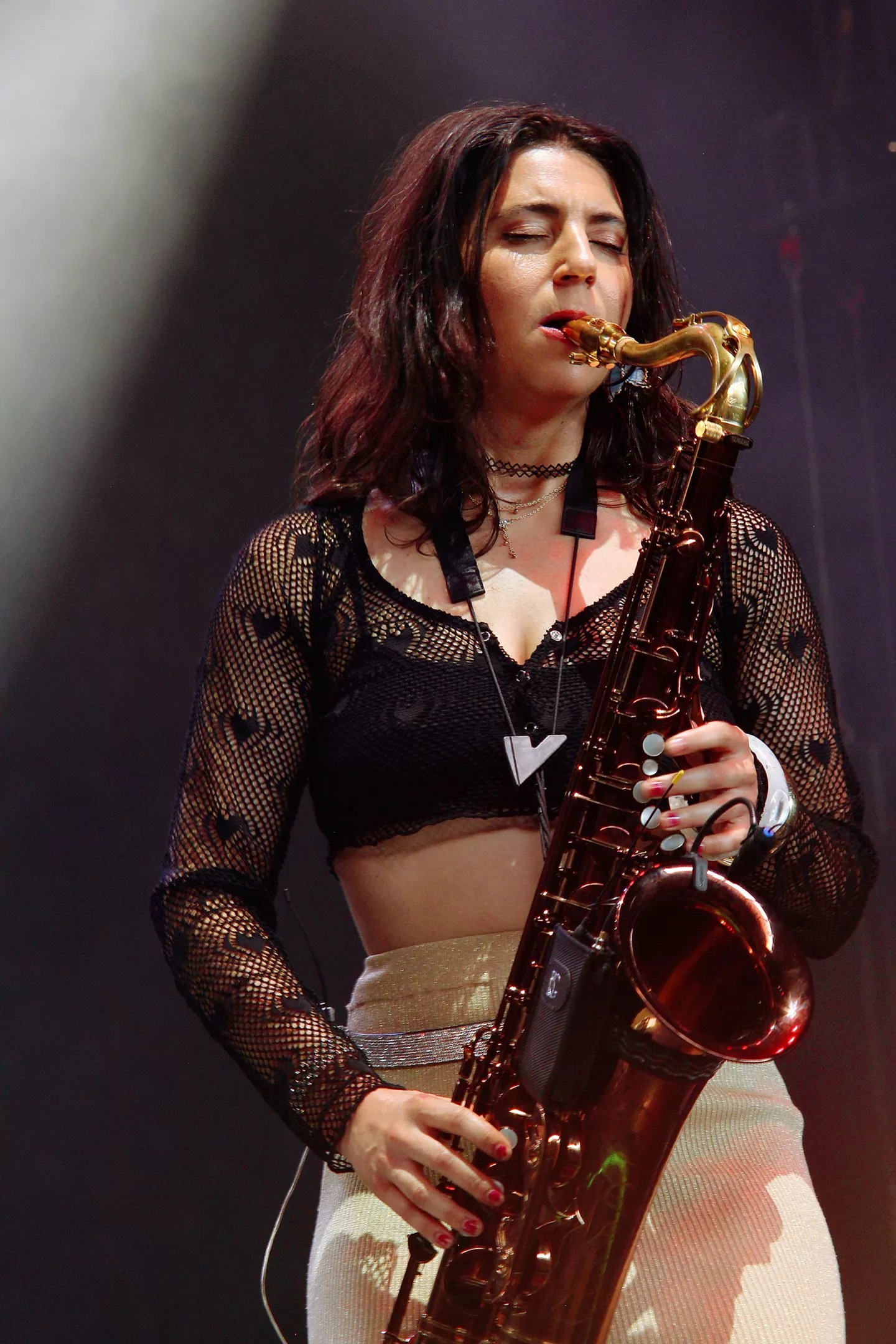 Rachel Mazer captivates the crowd with her saxophone skills and dynamic stage presence.