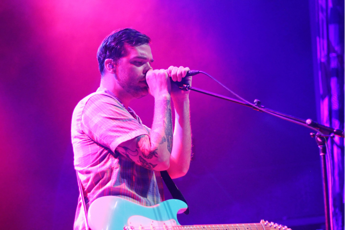 With the room buzzing from Balance and Composure, Turnover walked onstage to a wave of fervent cheers, ready to deliver the reason most were there. Austin Getz, frontman and guitarist, greeted the crowd with a warmth that matched the still-climbing temperatures in the venue. Clad in a War Hungry tee that clung to his muscled arms, he joked, “Thanks for sweating it out with us tonight.” Then, with little preamble, the opening notes of Peripheral Vision‘s first track, “Cutting My Fingers Off,” floated out; the room dissolved into a collective singalong.