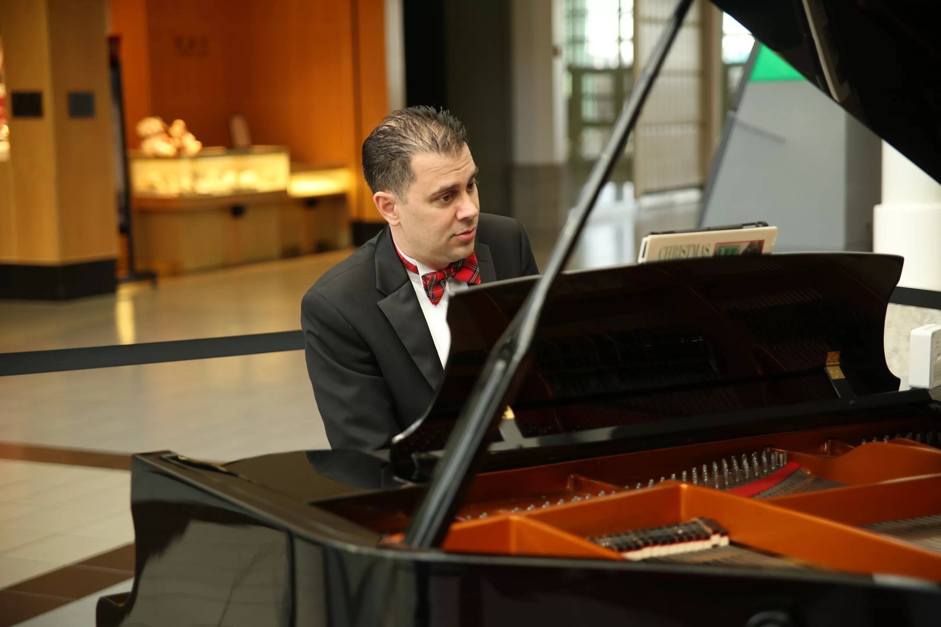 Jimmy Emery, a local pianist, has played a few gigs there already. He used one of the mall’s new grand pianos, which sits next to the 35-foot-tall Christmas tree on the center court stage.