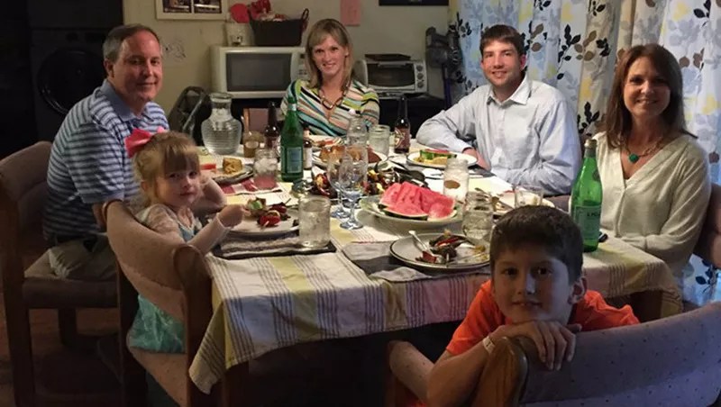 Members of the Briggle family share dinner with Texas Attorney General Ken Paxton (left) at their Denton home.