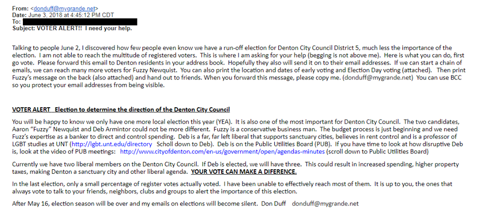 A screen grab of Don Duff’s email to his following. Duff, a member of Denton City Council, urged Denton voters not to support Deborah Armintor.