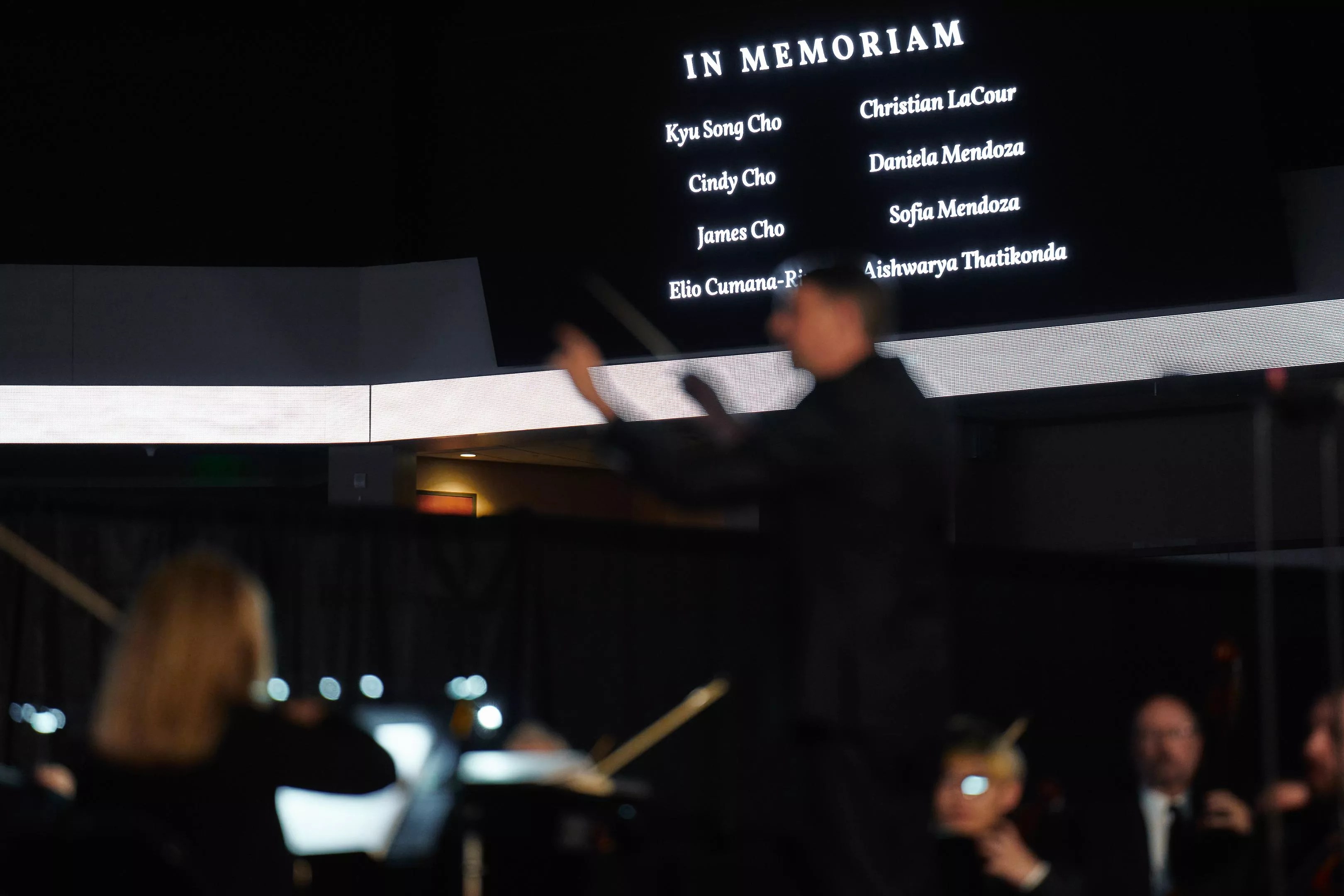 The names of the eight Allen victims were listed on screens during the orchestra’s performance.