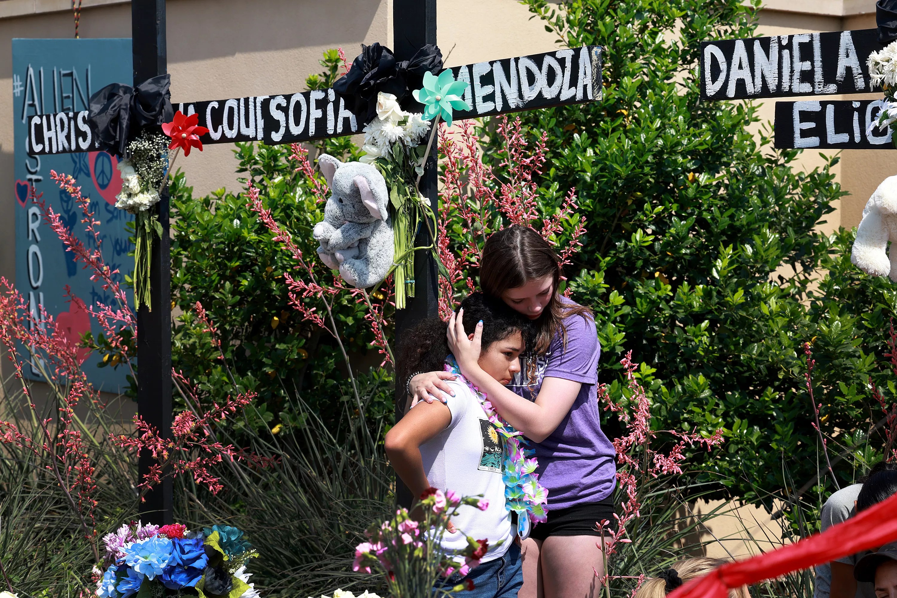 Emma Hampton (R) comforts a child as she visits a cross that bears the name of her best friend at the memorial set up at the Allen Premium Outlets mall.