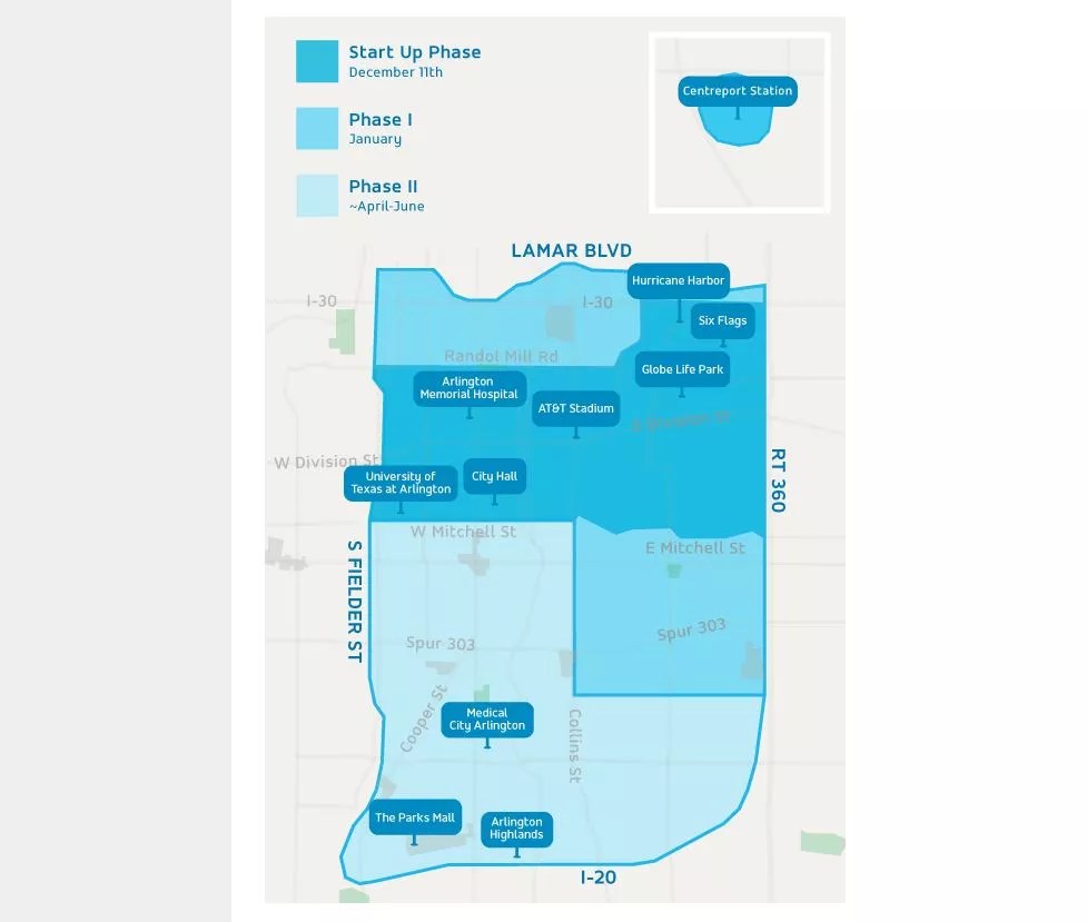 Starting Monday, passengers can get rides within an area that includes Globe Life Park, Six Flags, AT&T Stadium, the University of Texas at Arlington and Arlington Memorial Hospital. That covers most of the reasons one might have for going to Arlington. It also includes the Trinity Railway Express’ CentrePort Station at D/FW International Airport. In January, areas to the northeast and south of the entertainment district will begin service, to be joined by the final service area, which includes Medical City Arlington and the Parks Mall, sometime in the spring or summer.
