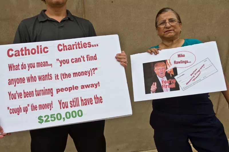 LULAC members protest outside City Hall, demanding to know why Catholic Charities of Dallas has not disbursed money from a 0,000 city grant to help West Dallas homeowners with repairs.