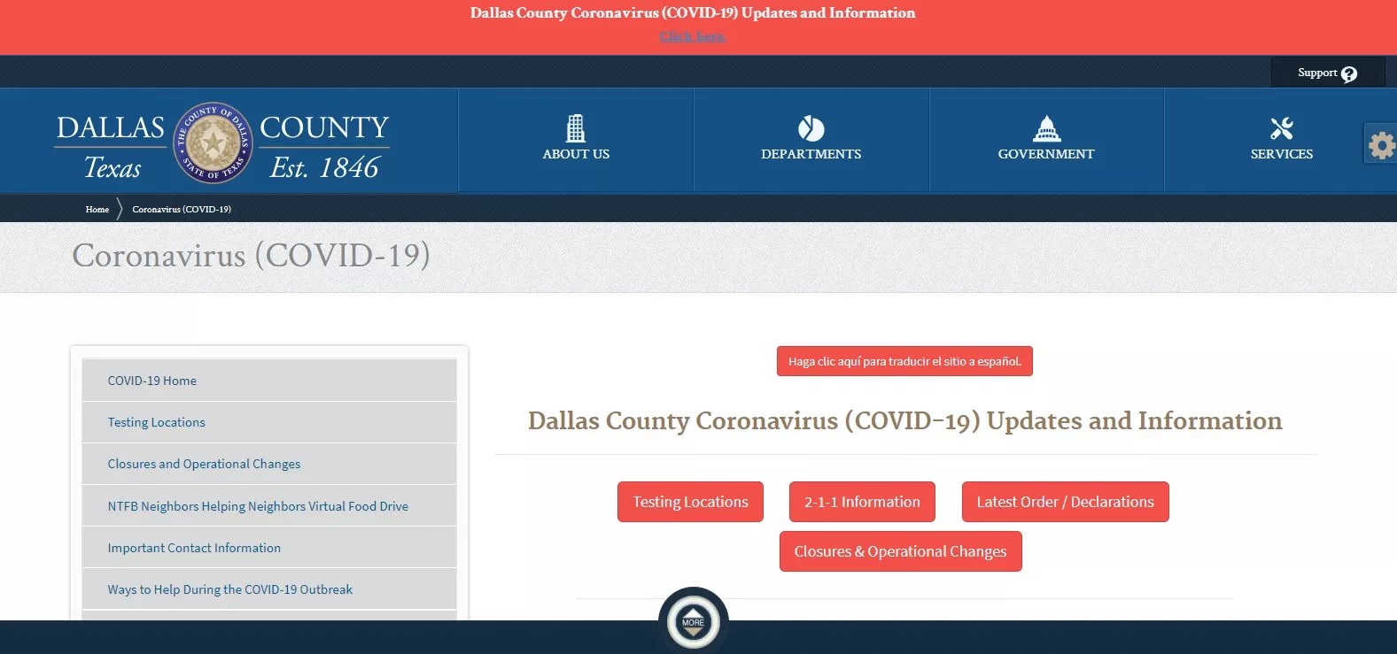 Now look at Dallas County. The first thing you see is a bureaucracy page with things like a phone number for the COVID-19 mental health support line. I’m not saying that’s a bad thing. It’s just that I feel more like calling the mental health support line after trying to navigate the webpage.