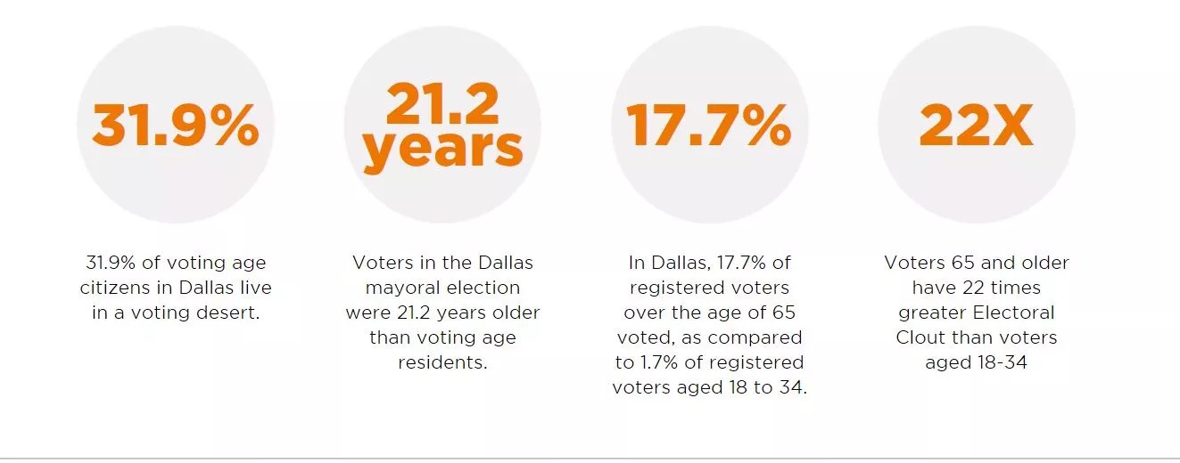 Voter apathy of the type that’s permeated Dallas recent elections leads to some voters wielding disproportionate influence. In 2015, the median age of voters in the Dallas election was 62. The median age of Dallas’ overall adult population was 41. Breaking things down further, 17.7 percent of Dallasites over 65 cast ballots in the mayoral election. Among 18- to 34-year-olds, turnout was 1.7 percent. Dallas’ senior voters, in other words, had 22 times more impact on the election than its 18- to 34-year-olds, according to the study.