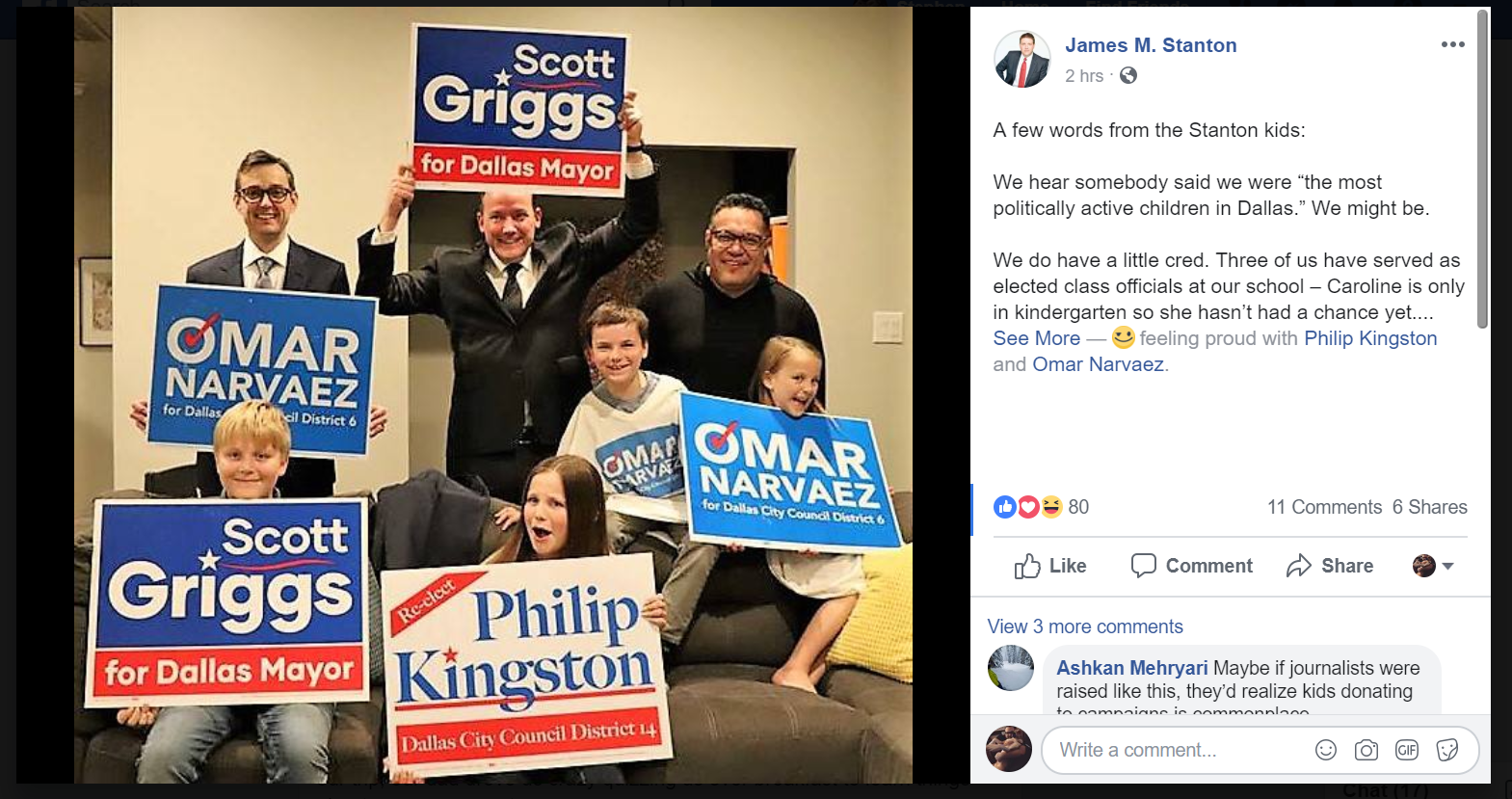Further update: Feb. 1, 10:51 a.m. – Two days after initial reports that he received campaign contributions from James Stanton’s four young children, Dallas mayoral candidate and City Council member Scott Griggs issued the following statement: The Stanton family is remarkable. I applaud the family’s commitment to democracy and being involved. I trust the Stanton family will stay involved and I hope more children learn about our democracy and political process. Council member Omar Narvaez also told the Observer on Friday that, rather than returning the donations from the Stantons, he intends to send them to organizations that focus on voter education and getting out the young adult vote. Update: Feb. 1, 9:58 a.m. – James Stanton III released the following statement, framed as a letter from his kids, Friday morning: