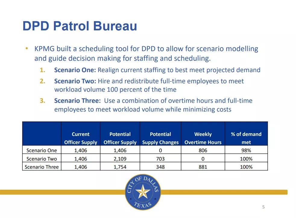 Rather than a simple answer, KPMG presented three scenarios that could get the department close to its goal of responding to every Priority 1 911 call in under eight minutes. At current staffing levels, according to the report, the police department can leverage 806 weekly overtime hours and meet 98% of demand. It can hire 703 officers and meet 100% of demand without giving out any overtime work, or spread 881 overtime hours around and meet all of Dallas’ demand by hiring 348 more officers.