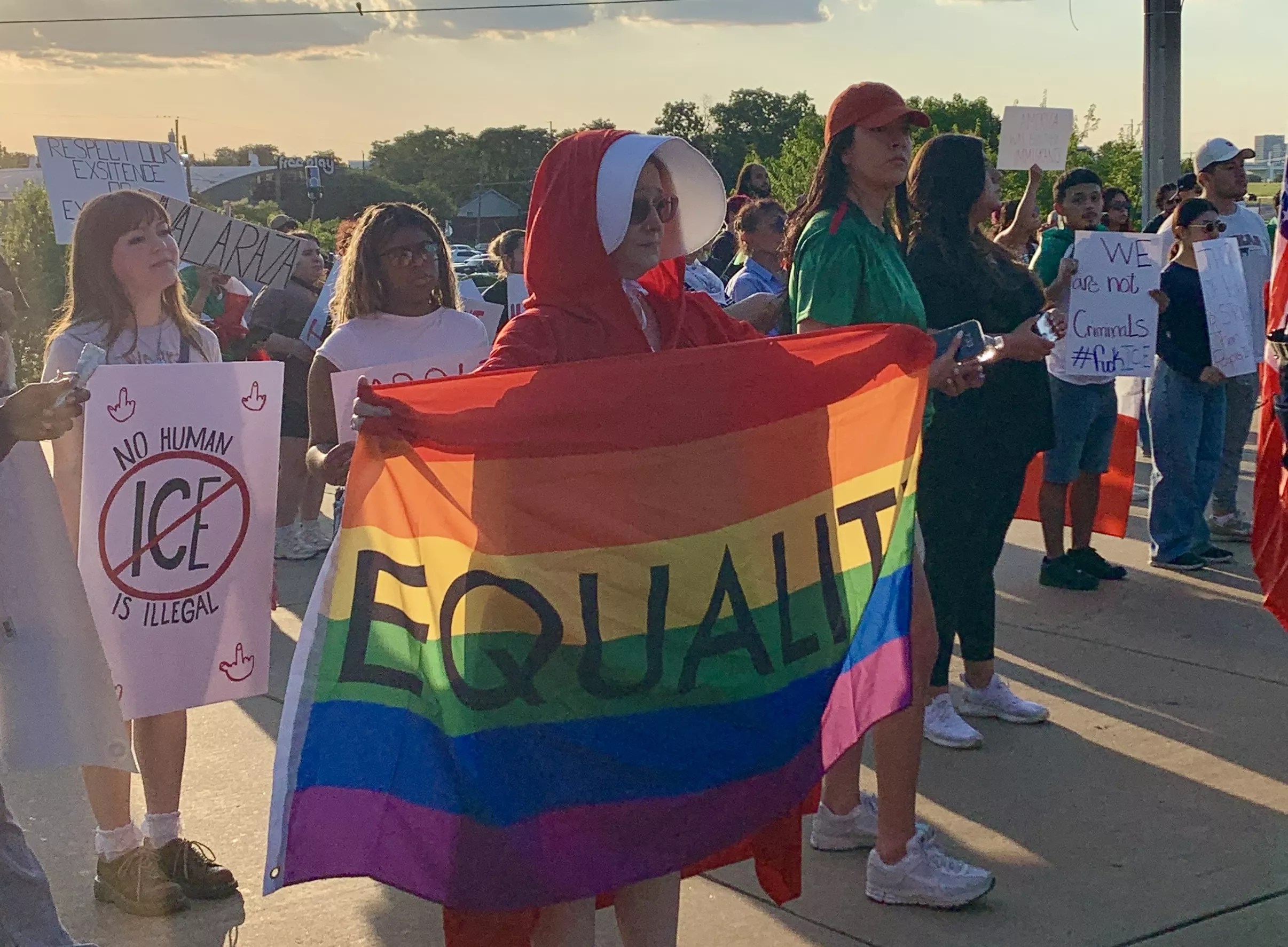 One woman, Michelle J., stood alongside Singleton Boulevard in the red cape and white bonnet made famous by The Handmaid’s Tale, waving a rainbow flag that read “equality.” She asked that her last name be omitted from this report because of law enforcement surveillance of demonstrators.