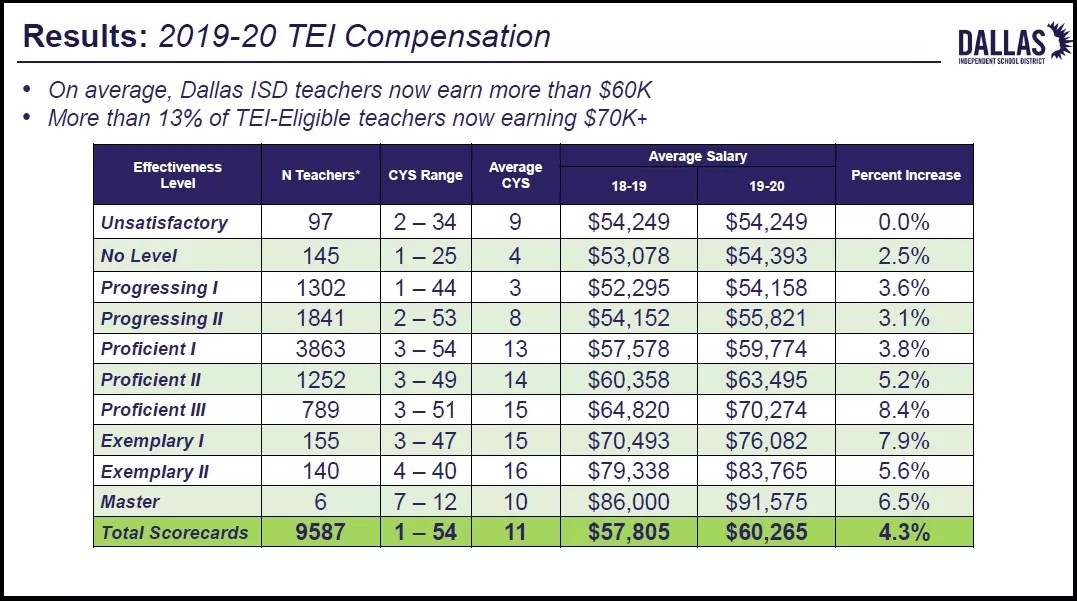 An outcome of school reform in Dallas since 2015 is that the Dallas public school system now pays a higher salary to its best teachers – by quite a bit – than any other public school system in the state. The highest-ranked teacher in Dallas now earns $91,575 a year.