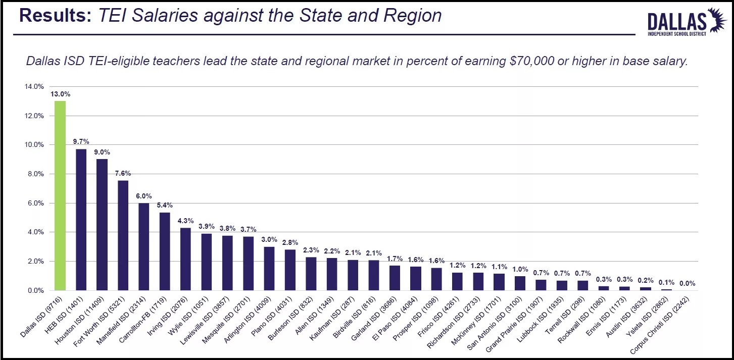 The percentage of Dallas teachers earning more than $70,000 is 65 times the percentage in Austin. The incentive pay to go teach in the toughest schools is an amount on top of those salaries.