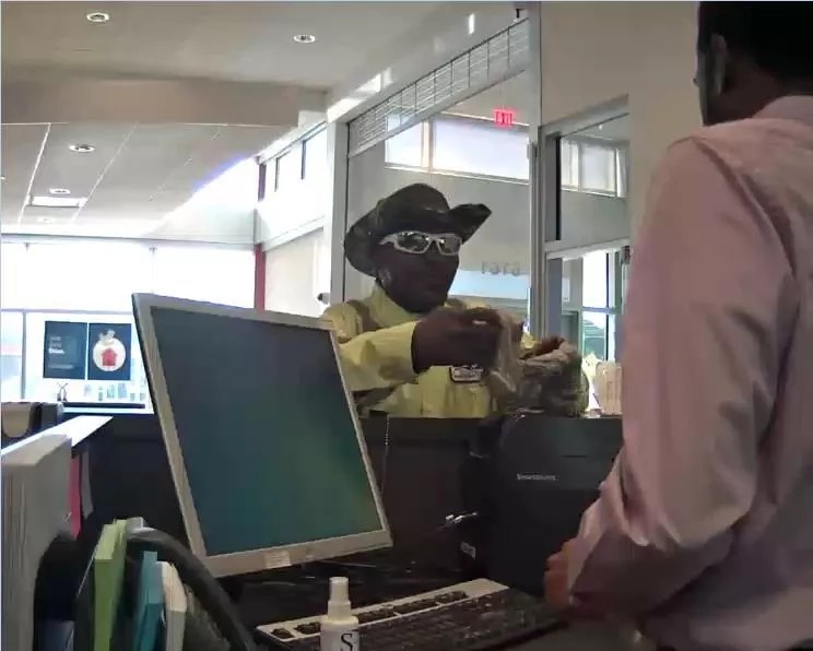 A man in a city of Dallas-issued reflective vest and a camouflage cowboy hat walked into the Capital One bank branch at 6161 Retail Road on Oct. 23. He handed the teller a note demanding cash. She gave him some, along with a dye pack.