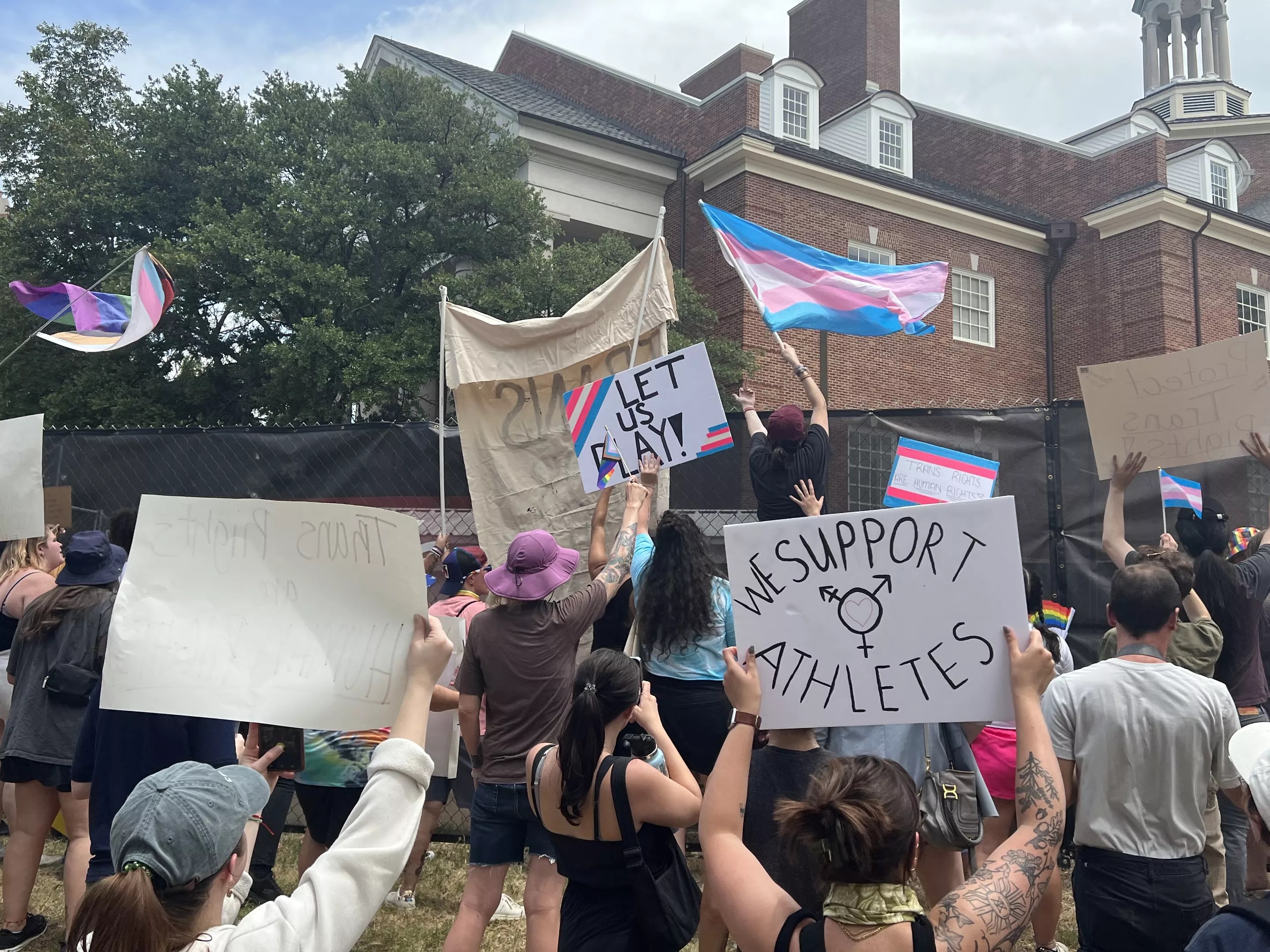 Protesters on Monday railed against the so-called Save Women’s Sports Act for being anti-trans.