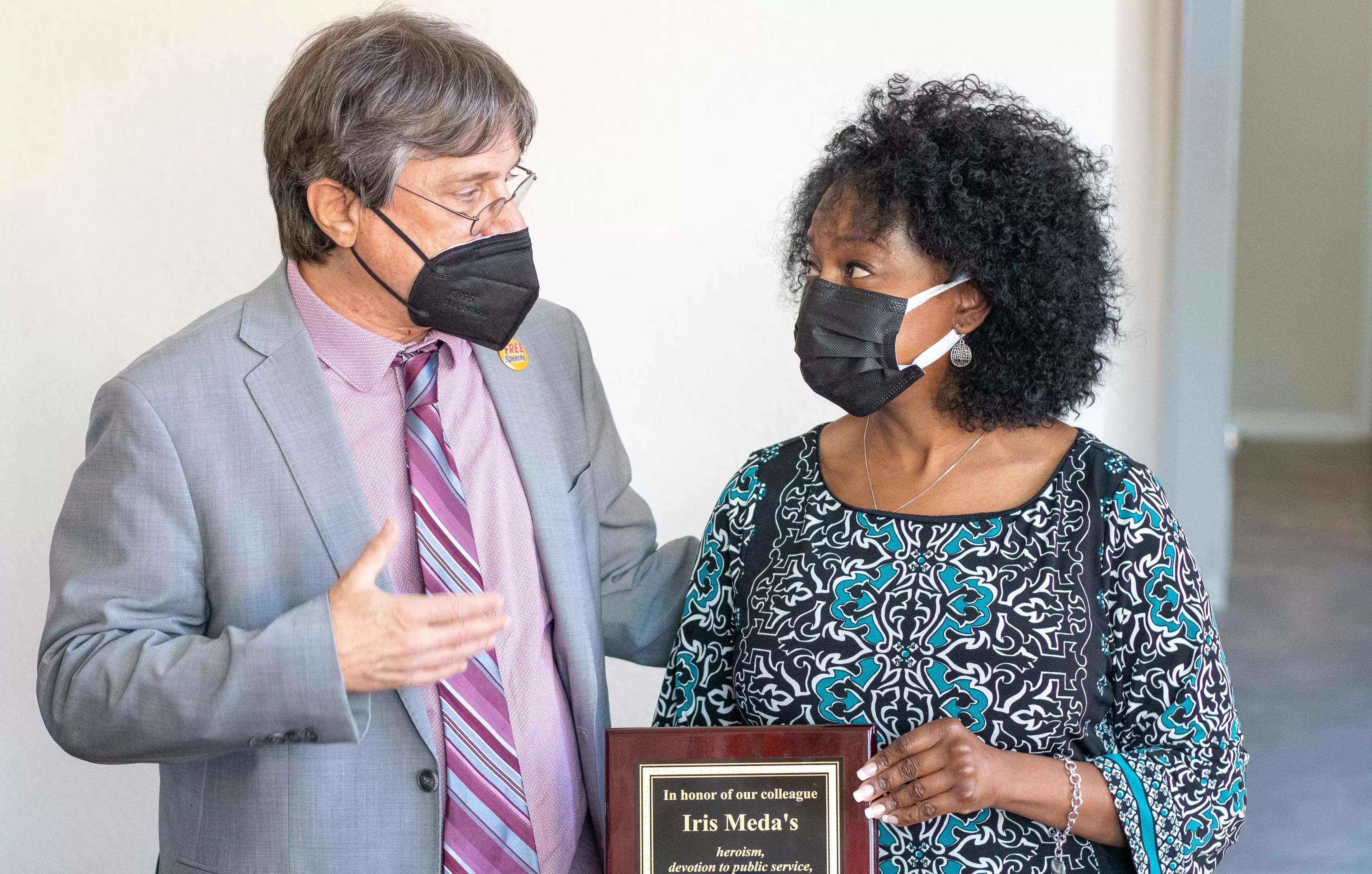 It’s been a challenging year for the family of Iris Meda, a Collin College nursing professor who died of COVID-19 last November. But smiling through tears on a brilliant autumn afternoon, her daughter accepted a plaque honoring Meda’s service.