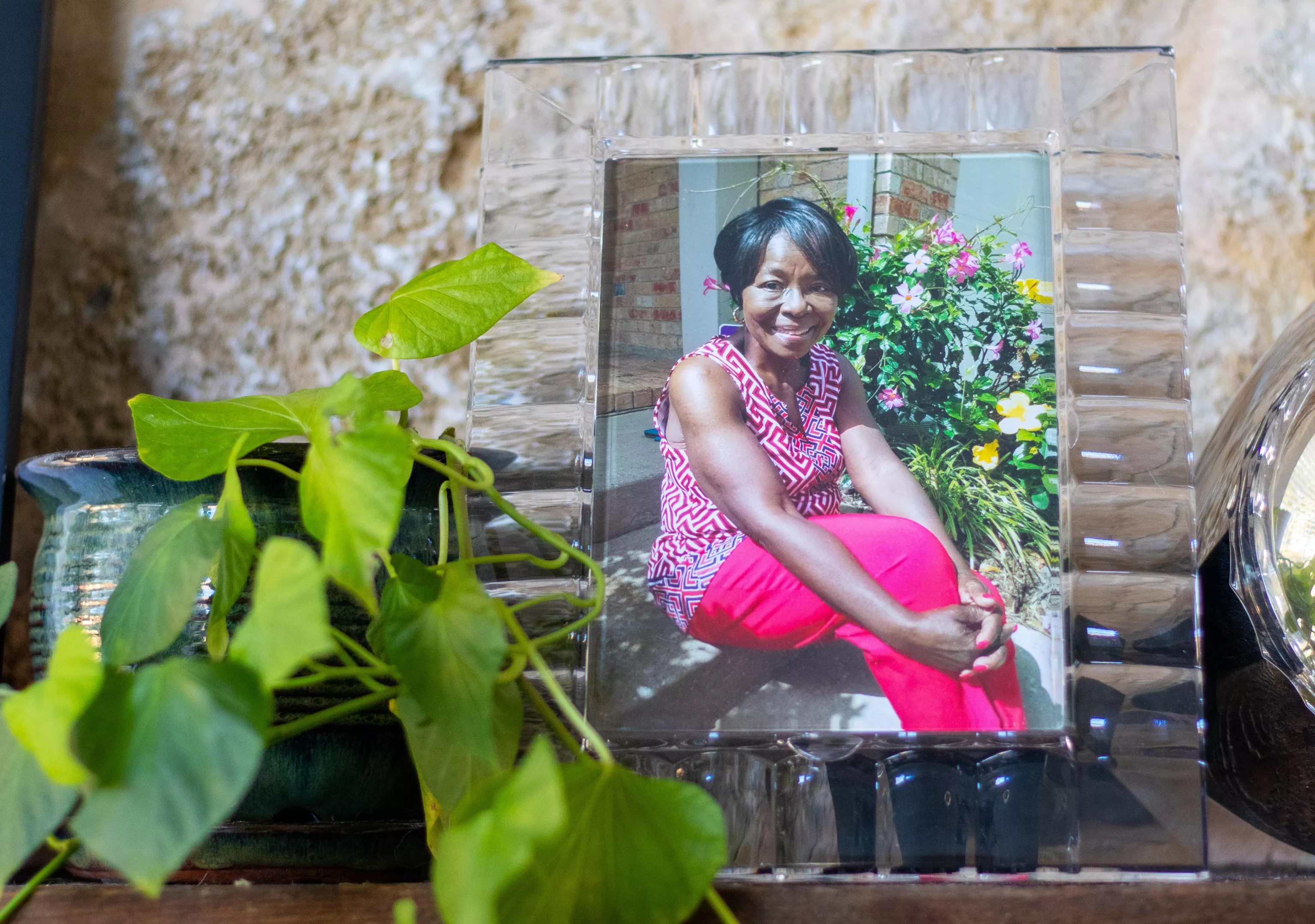 Meda had a green thumb; one of her house plants rests on her daughter’s living room mantle. A photo of Meda stands there, too. Sitting on the steps in front of a bush filled with colorful flowers, she beams at the camera, dressed in hot pink.