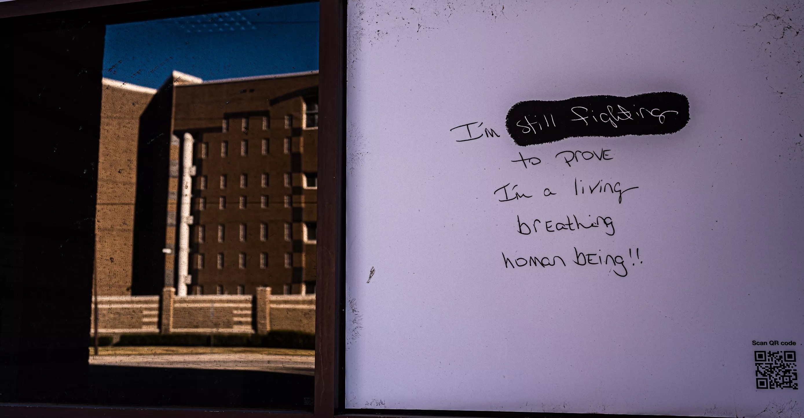 A message scrawled on the back of a sign across the street from the Dallas County Jail echoes the cries of the prisoners.