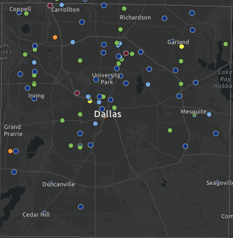 A map showing all vaccination sites in Dallas County.