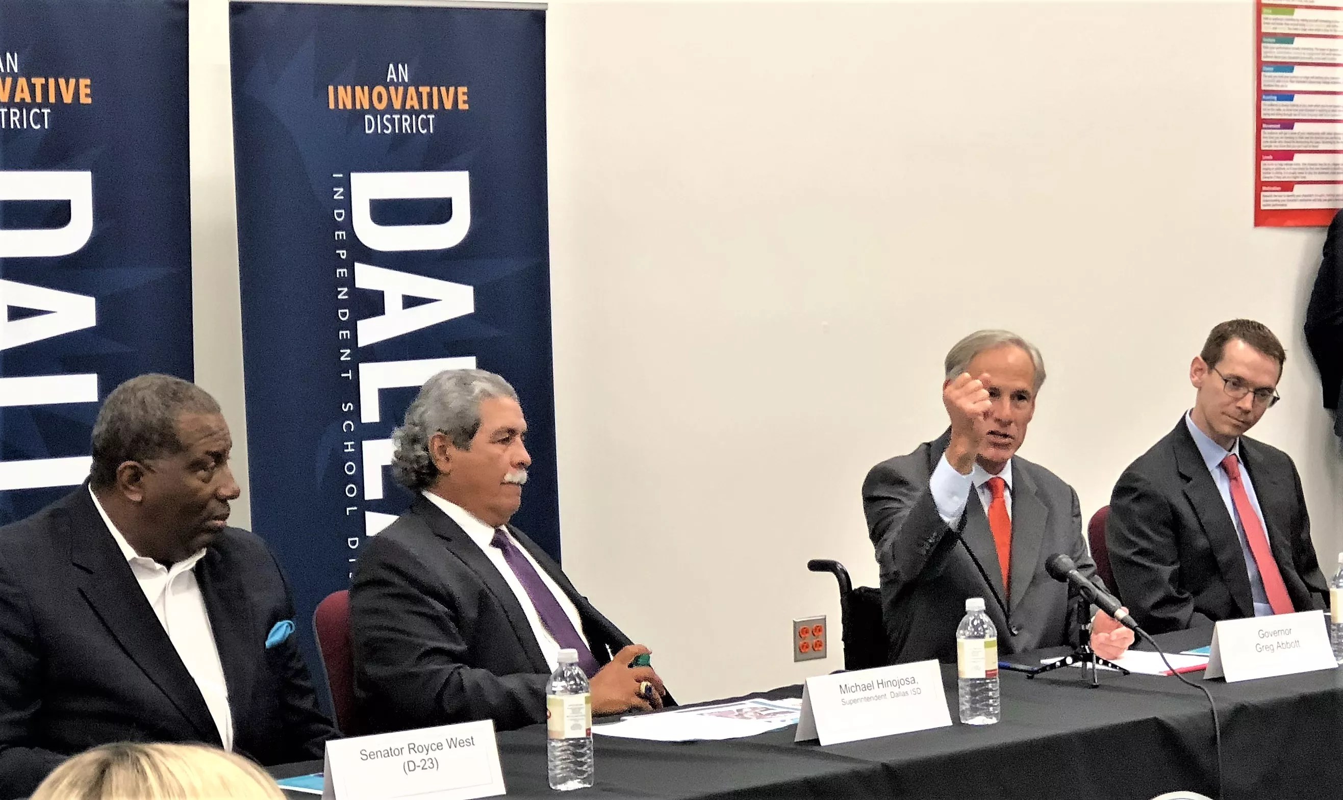 Left to right, state Sen. Royce West, Dallas ISD Superintendent Michael Hinojosa, Texas Gov. Greg Abbott and Texas Education Commissioner (and former DISD trustee) Mike Morath