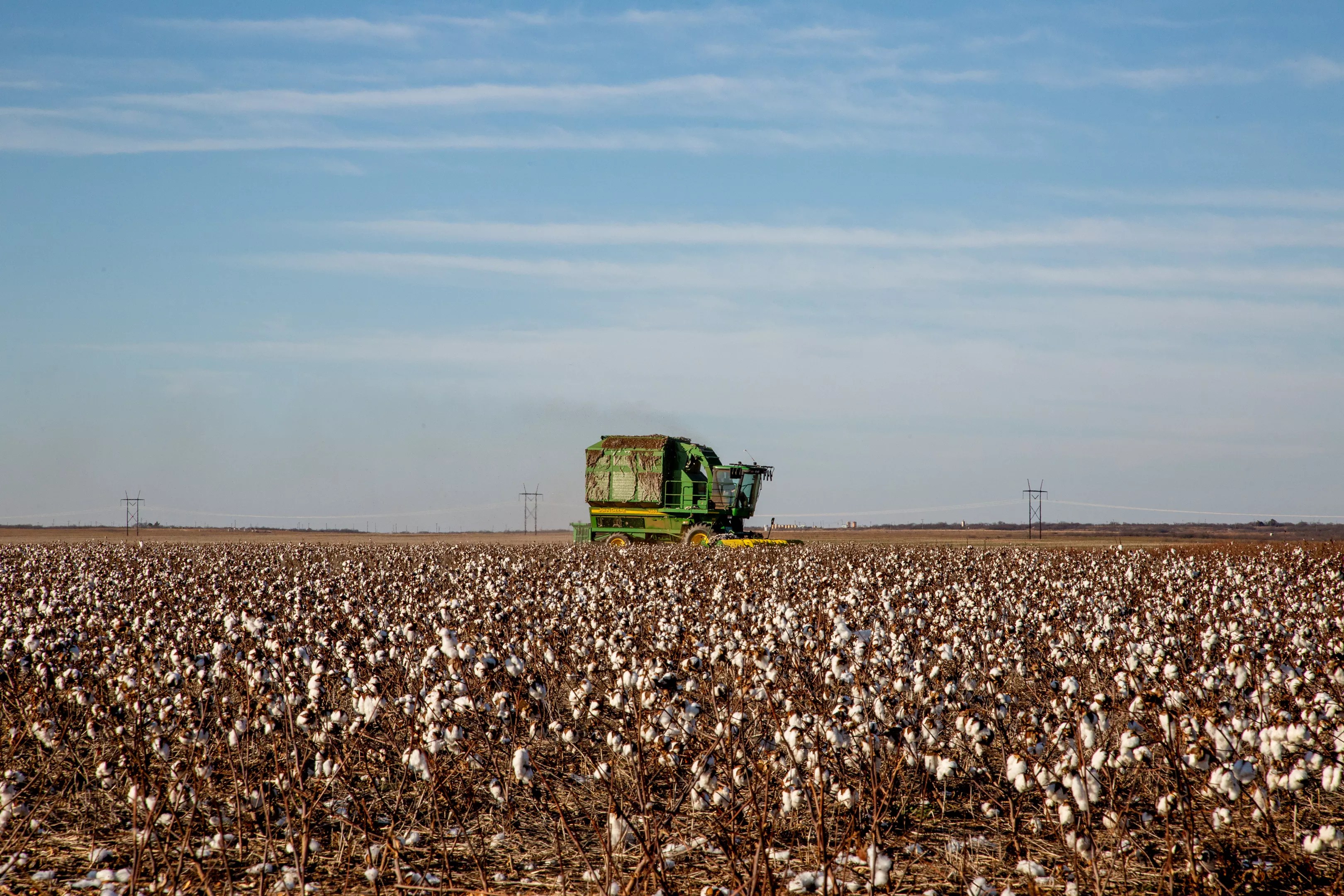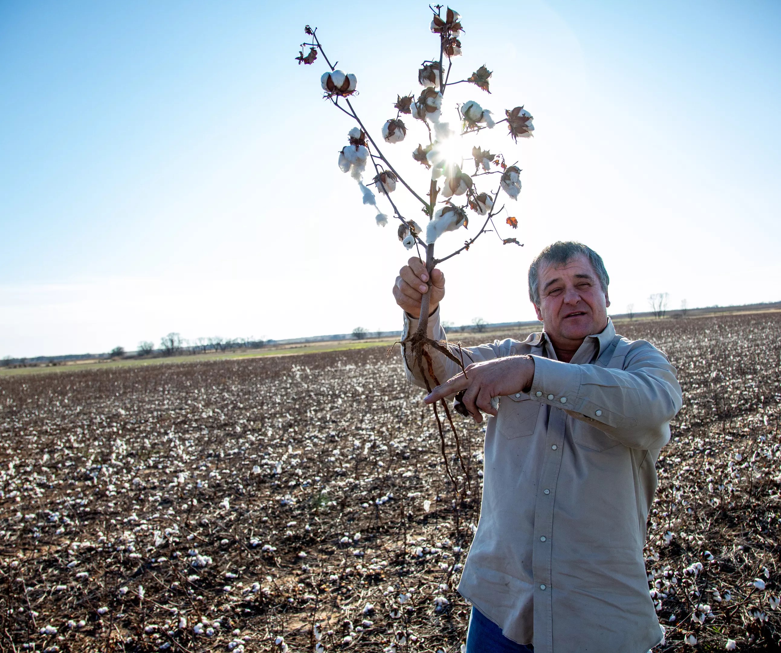 Healthy cotton yields three or four bales per acre, and McAlister says he has to make a bale and a half to two bales per acre for a crop to be worth harvesting. This year, he guesses his fields would have produced about a quarter bale per acre.