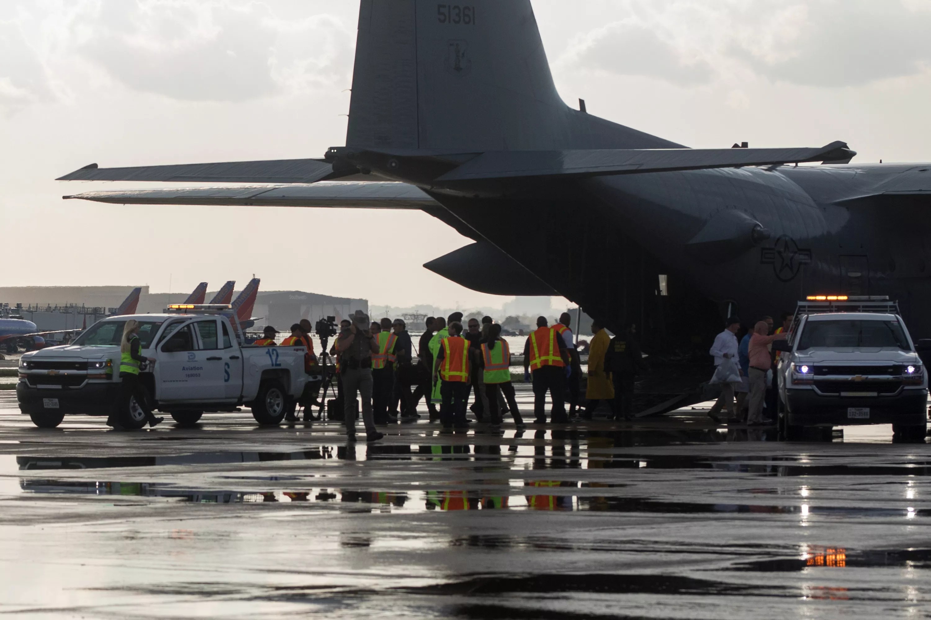 A group of evacuees headed for Irving arrives at Love Field on a C-130 late last week.