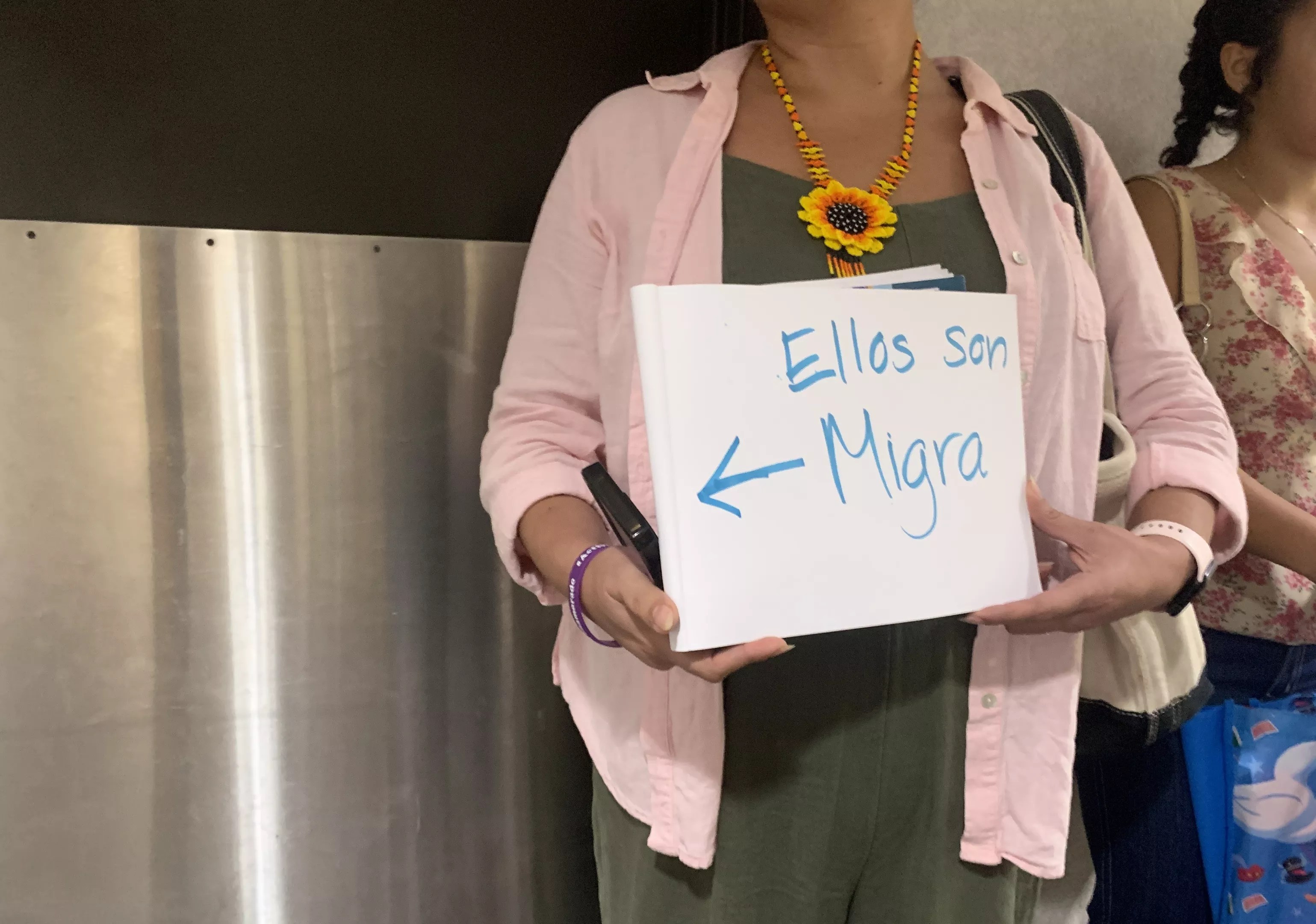 Rios pulls a large notepad out of her bag and flips it open. On the page, “Ellos Son Migra” is written in bright blue marker. A blue arrow points toward the men whose eyes are trained on the doors of courtrooms.
