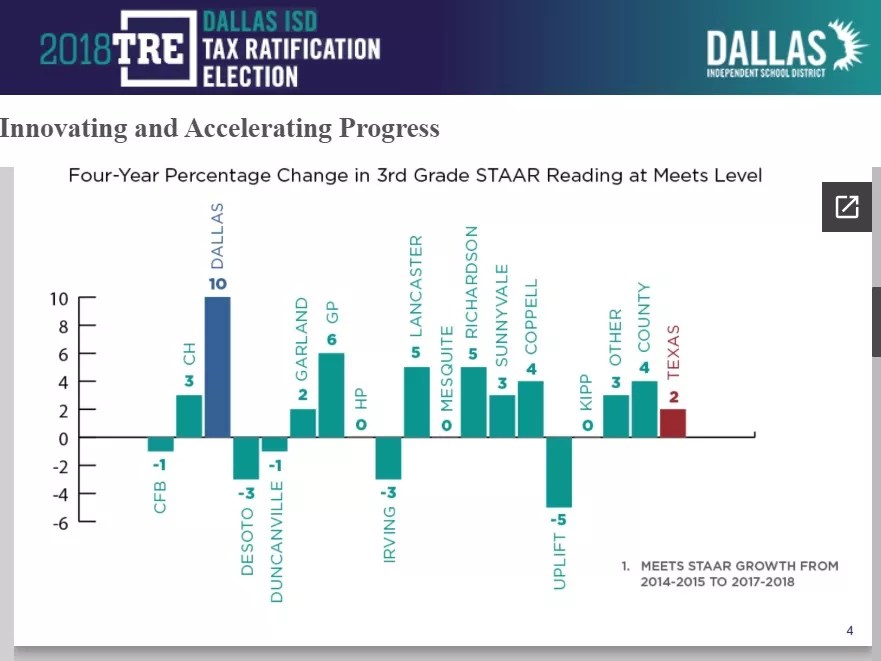 And guess what? In five years, the schools considered by the state to be failing – no good, in danger of being closed under state law – have diminished from almost 20 percent of all Dallas schools system-wide to 1 percent. Meanwhile, the Dallas public school system leads all its peer cities in the state in the improvement of reading scores for young children.