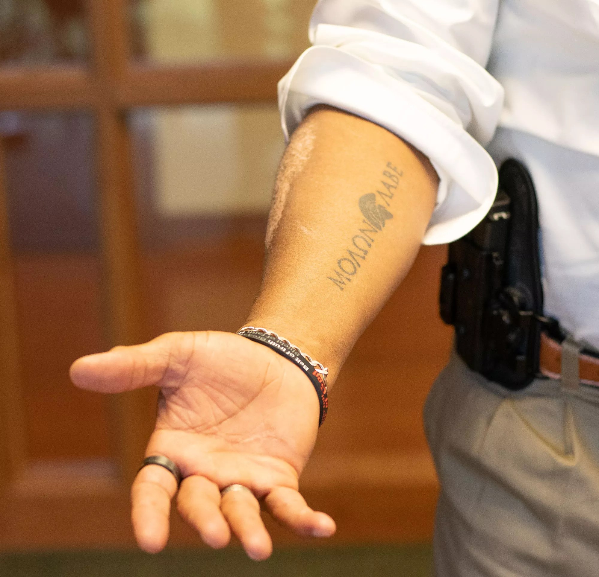 “Come and take [them],” reads a tattoo on Allen West’s forearm.