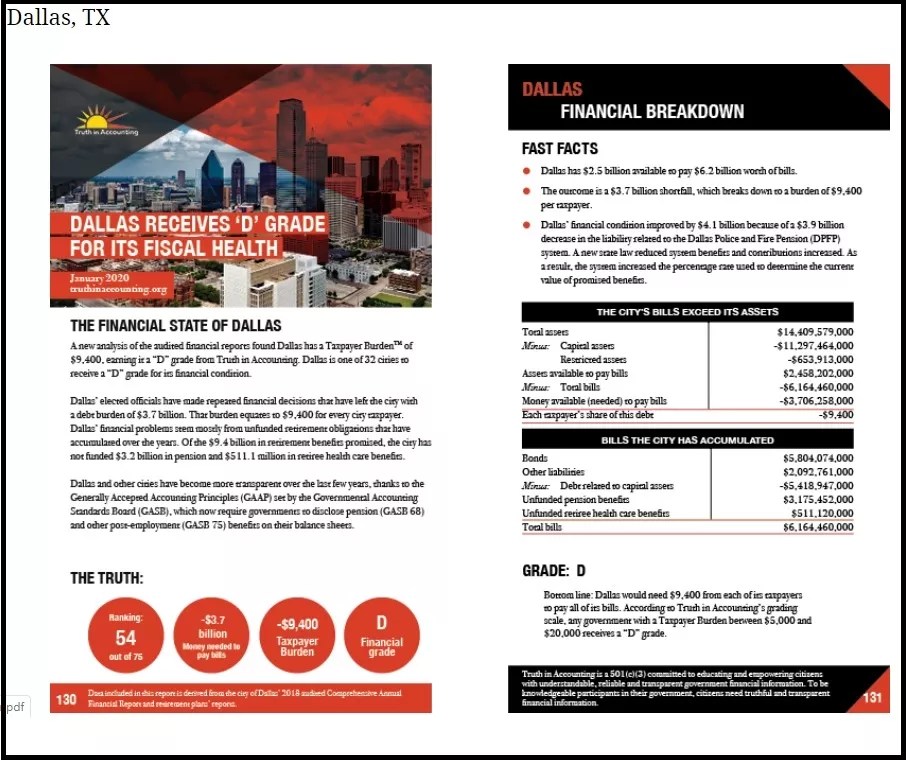 For a city run for decades by so-called conservatives, Dallas looks a little too much like Bernie Madoff. The report gives Dallas an overall financial grade of D for having a municipal debt of $9,400 per taxpayer.