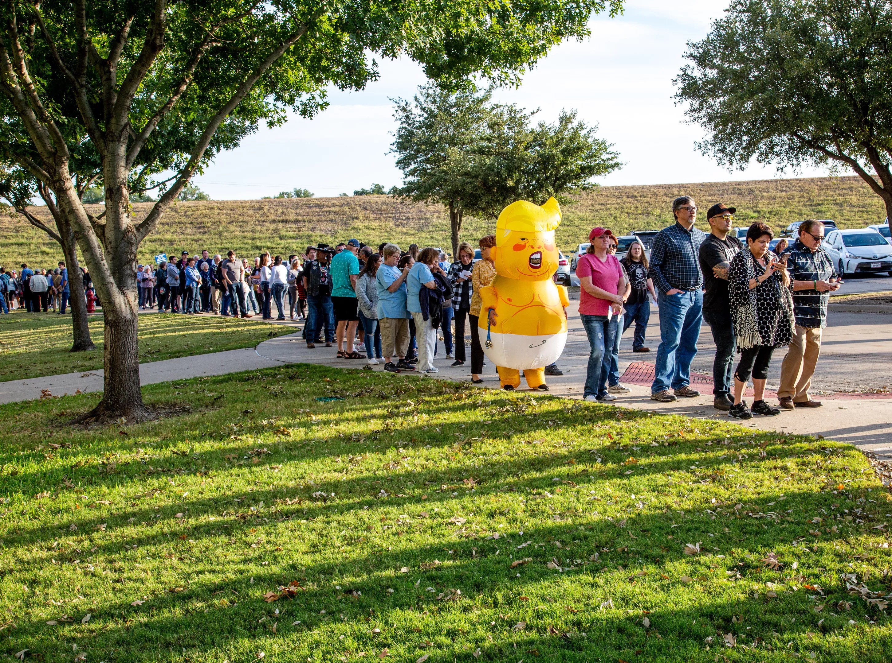 Many supporters turned out to see O’Rourke. Including this one in an inflatable baby Donald Trump costume.