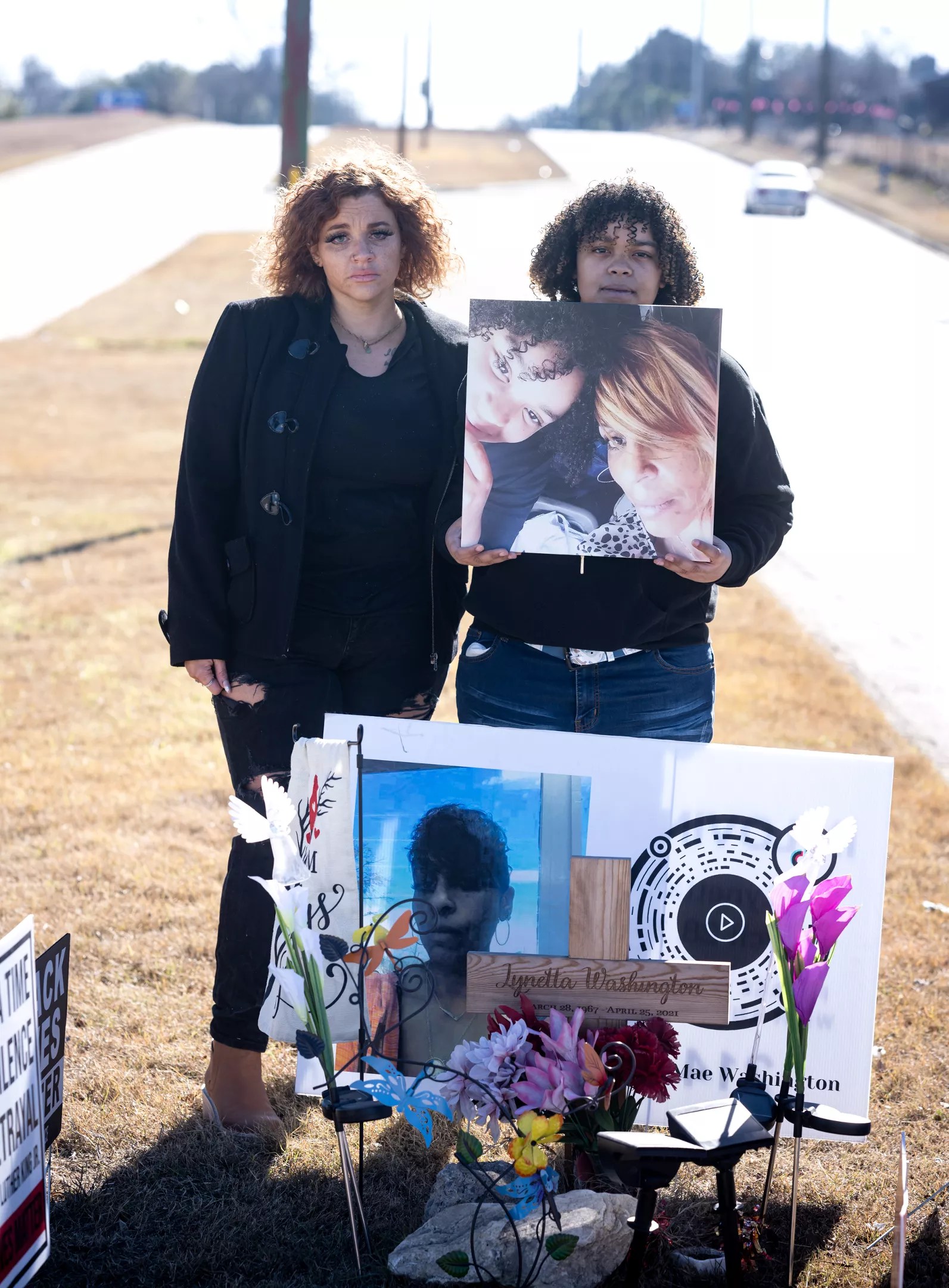 Angel Durr and Myah Hill stand behind a memorial to their mother, Lynetta Washington.
