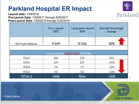 RIGHT Care’s proponents – the city, DPD and the Parkland Health and Hospital System – pin the program’s effectiveness on a key stat: In the two years after a pilot version of the program was launched in South Central Dallas in 2018, the number of admissions to Parkland’s psychiatric hospital facilities from the area declined by 20% overall.