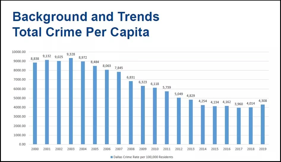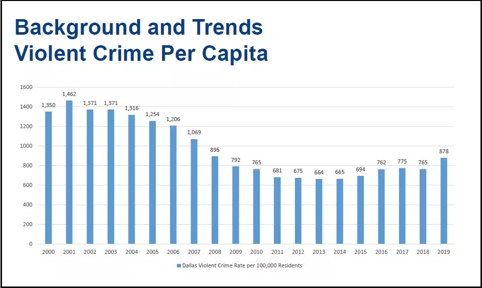 In 2018, violent crime in Dallas went down by 6%. In 2019, it went up again by 15%. No one knows what drives those cycles. A graphic compiled by the Dallas Police Department for a recent briefing shows a crime rate in Dallas during the economic boom years of the mid-2000s at twice what it is now.