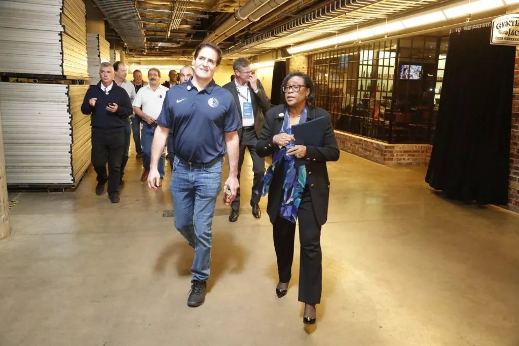 Owner Mark Cuban walks with new CEO Cynthia Marshall in February 2018.