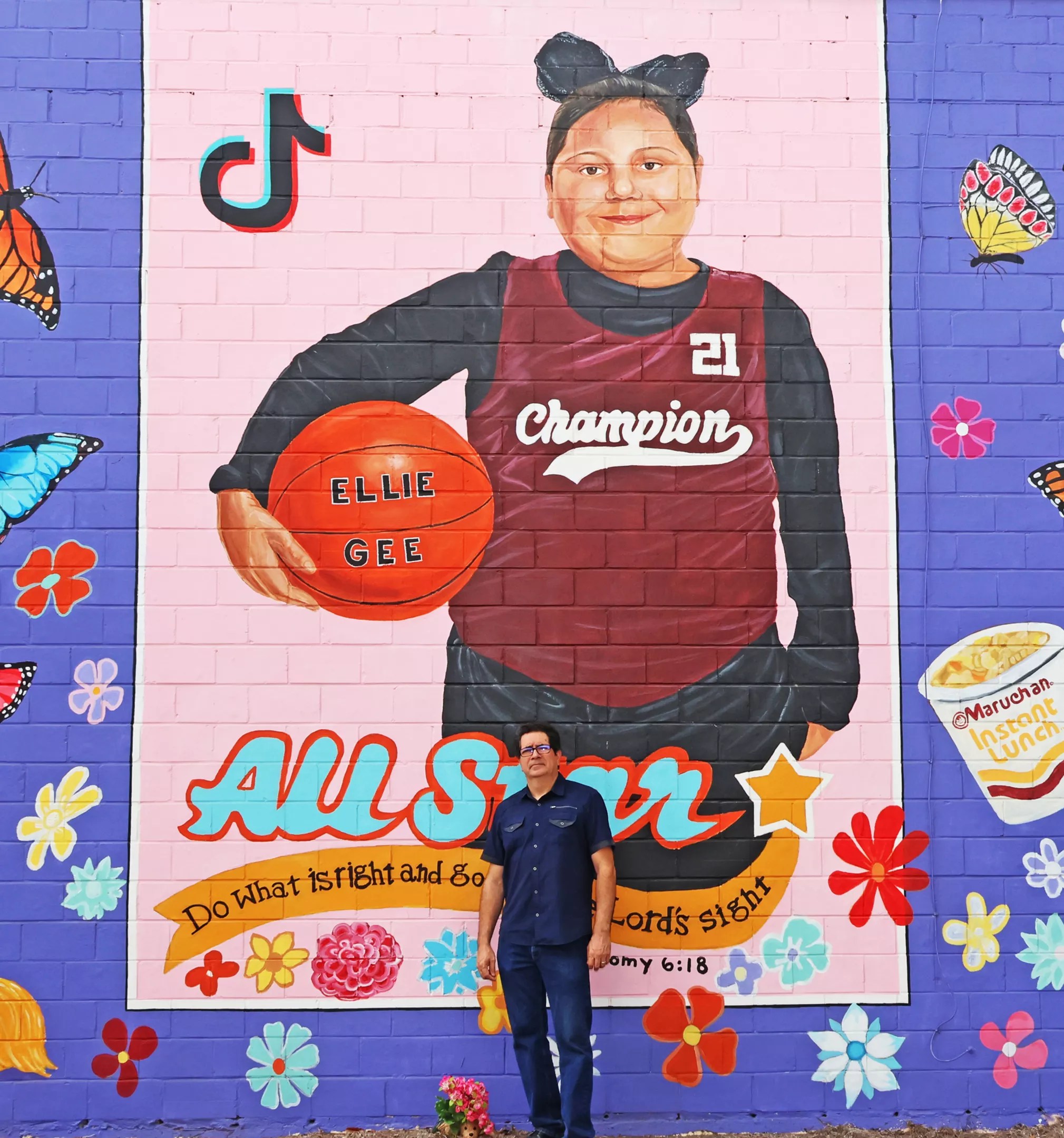 The butterfly-intensive mural for Eliahna “Ellie” Amyah Garcia, 9, makes it clear she enjoyed Takis, Maruchan Instant Lunch noodles and basketball. On the St. Henry De Osso Project building, Eva Mireles’ bright, flowery mural shows her beaming, with her arms held out, holding a Crossfit flag in one hand and a flag that reads “Always Strong” in the other. It’s fitting that a mural with the names of all who died in the attack is right next to hers – close to the kids, forever at her side now.