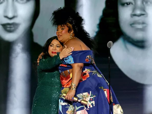 Lizzo comforts Maggie Mireles, sister of slain Uvalde teacher Eva Mireles, during the People’s Choice awards in December 2022.
