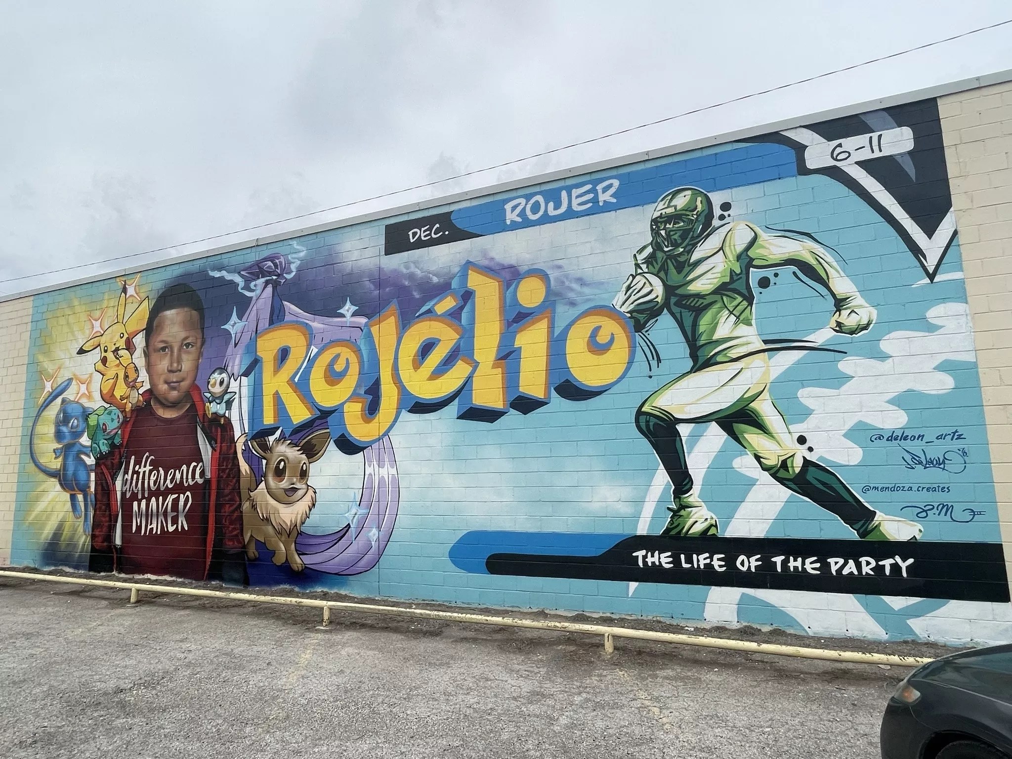 Rojelio Torres’ mural has his name spelled in Pokemon-style lettering with Pikachu and other characters crowding around the 10-year-old’s portrait. The painting of Tess Marie Mata, also 10, shows her giving a peace sign and surrounded by images pointing to her love of softball and the Houston Astros.