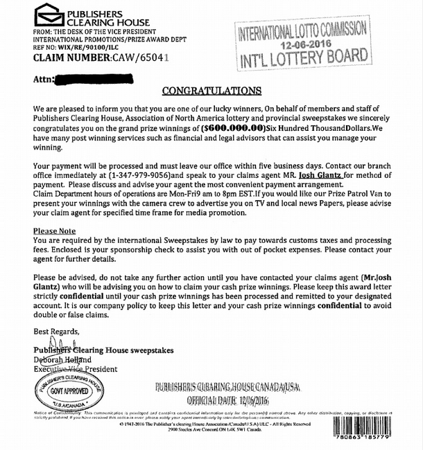“On December 2, 2016, an 85 year old women received a letter in the mail that led her to believe she had