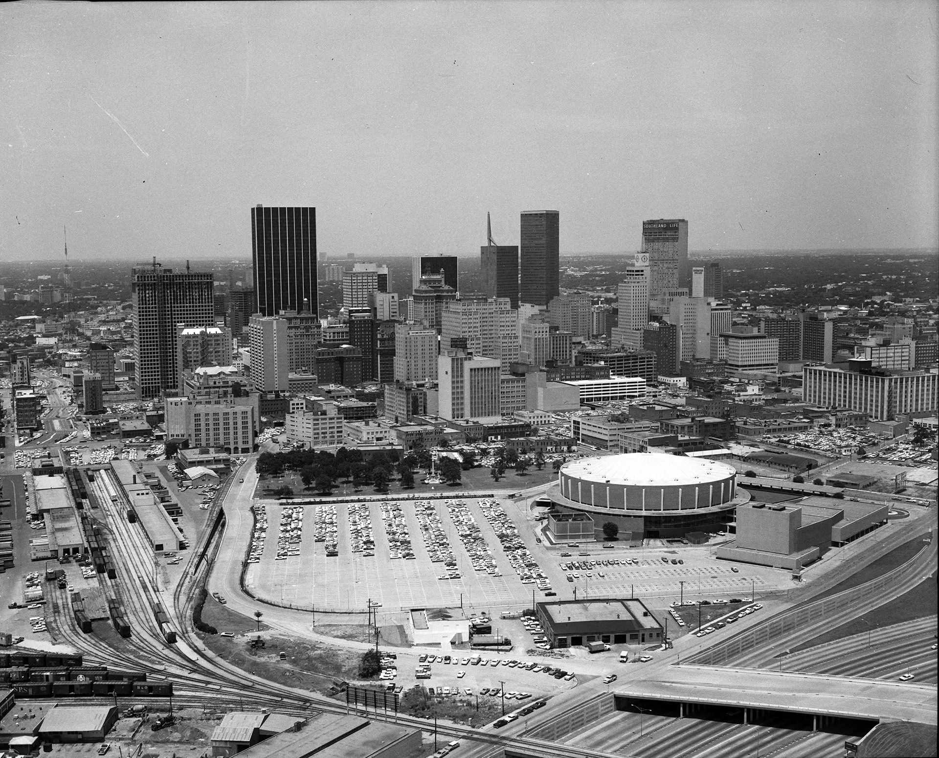Before the 1980s brought Reunion Arena and the 2000s welcomed the American Airlines Center, Memorial Auditorium was where A-list artists came to play. In 1968 alone, James Brown and The Doors played at the auditorium, not to mention this is where the Beatles made their only Dallas stop a few years prior. Led Zeppelin, Queen, the Rolling Stones and Jimi Hendrix are just a few other legendary acts to take the downtown stage before pro sports came to downtown. The Dallas skyline in 1976, still without Reunion Tower, as seen from the future Arts District – Woodall Rodgers areas. From the collections of the Dallas History & Archives Division, Dallas Public Library