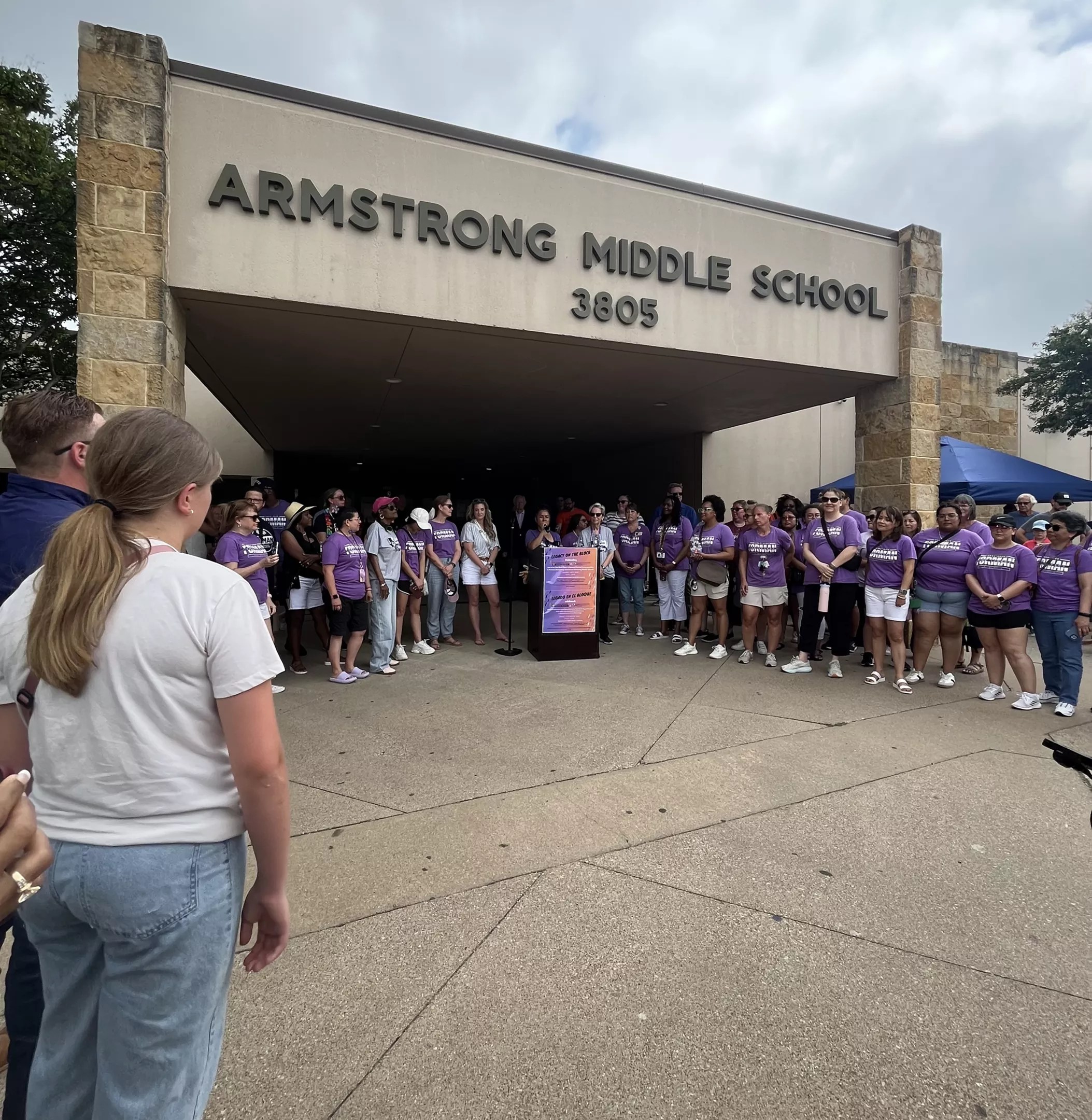 In addition to that, there was a Mobile Services on the Go truck parked a few minutes’ walk away from the welcome tables. They are part of the Welcome and Enrollment Center for Plano ISD. The mobile unit travels to neighborhoods in Plano and offers parents and students classes in financial literacy, computer basics, and learning English. They also help parents with enrolling their students, creating a SchoolCafe account to apply for free or reduced lunch, submitting volunteer applications, and completing district forms in Skyward Family Access. Faculty and families gathered at Armstrong Middle School one last time before it closes. Erin Runnels