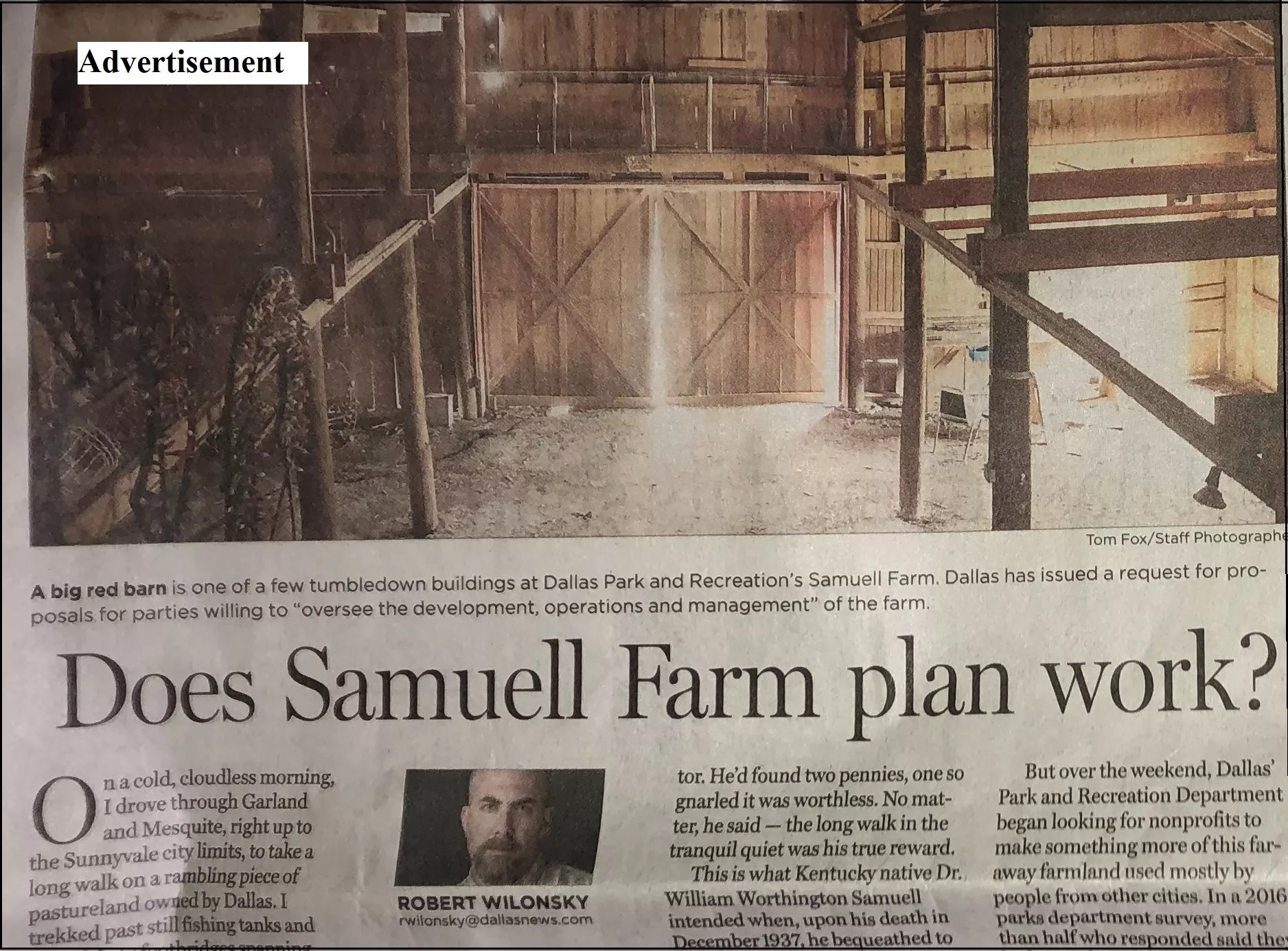 And that brings us to this latest iteration of don’t-ask-just-do-it. Samuell Farm is a benighted and neglected 600-acre city park two miles east of the city limits on Highway 80. Bequeathed to the city more than 80 years ago under a highly restrictive covenant, stranded from the city proper in an awkward location, Samuell Farm has struggled for decades to find a real mission, passing through periods of both benign and malign neglect.