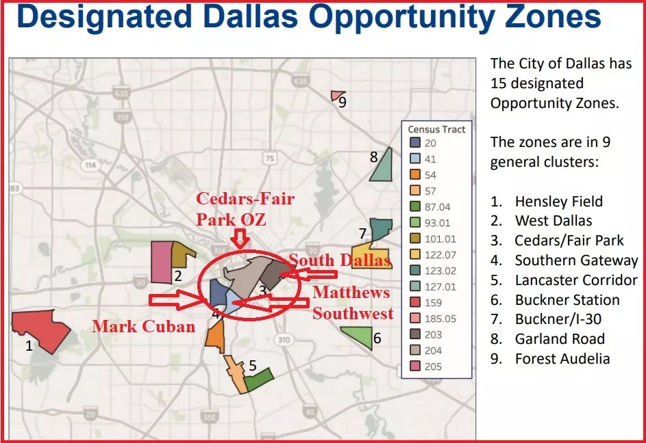 The meeting is Thursday in the offices of the Greater Dallas Chamber of Commerce. In addition to the PID connecting Matthews Southwest with South Dallas, one of these potentially lucrative federal opportunity zones also connects the two places like a red carpet.