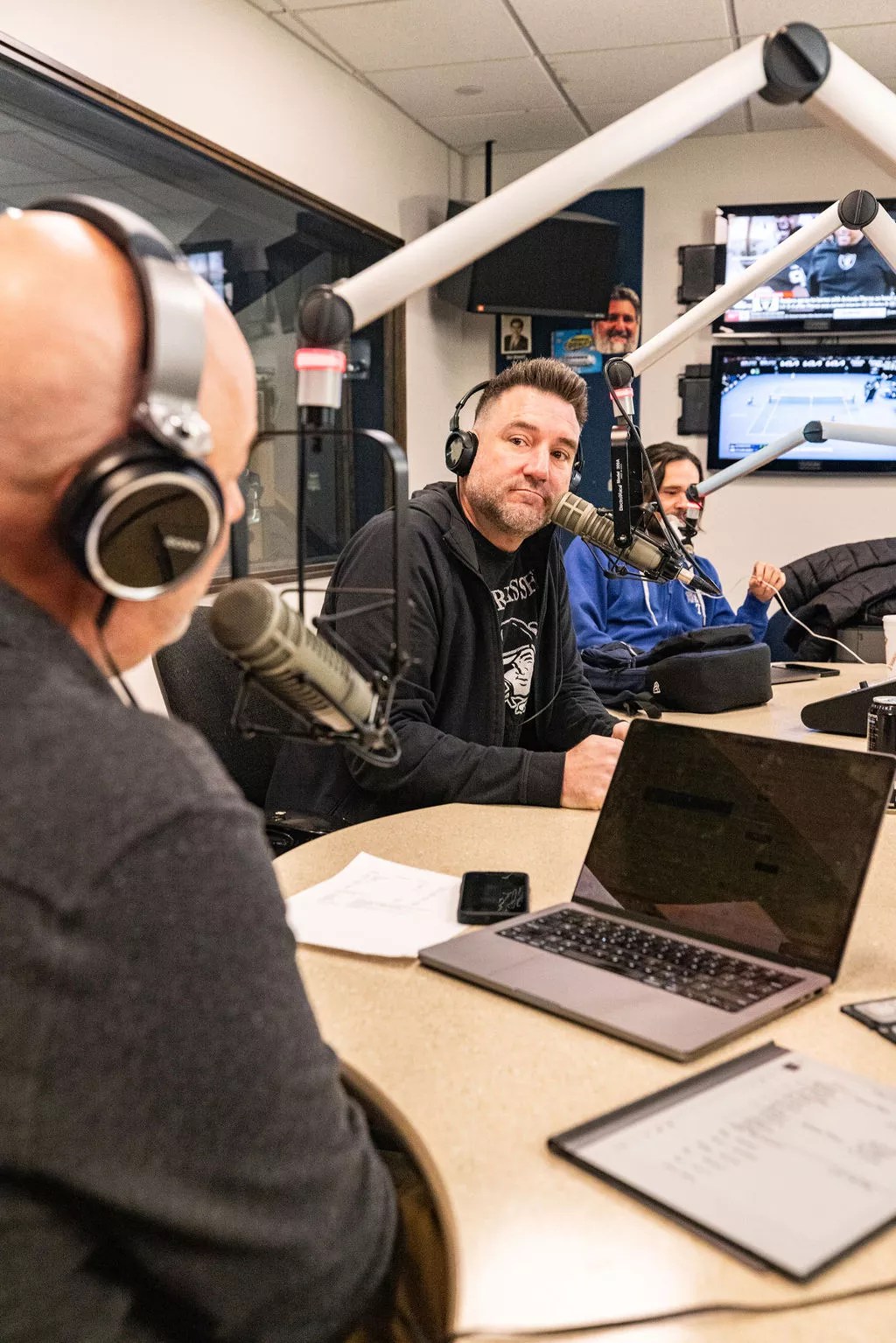 Dave Lane (center) listens to Bob Sturm (left) make a sports point on The Hardline.