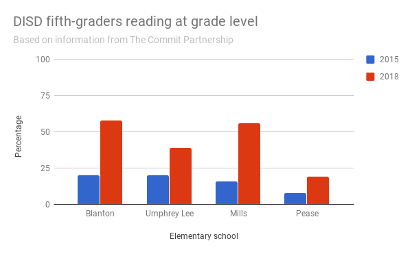 Those numbers are reproduced consistently in the elementary schools that were targets of the special teaching enrichment reforms started under former Superintendent Mike Miles and supported now by his successor, Michael Hinojosa. Umphrey Lee Elementary, 92 percent economically disadvantaged, has gone from 20 percent of fifth-graders reading at grade level in 2015 to 39 percent now.