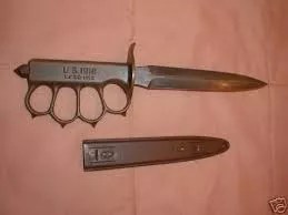 The trench knife was first introduced in World War I, and later designs included a 6.75-inch double-edged blade and a handle made of cast bronze with a finger guard known as the “knuckle duster.” The butt of the knife also contained a nut that held the blade in place and acted as a “skull crusher.”