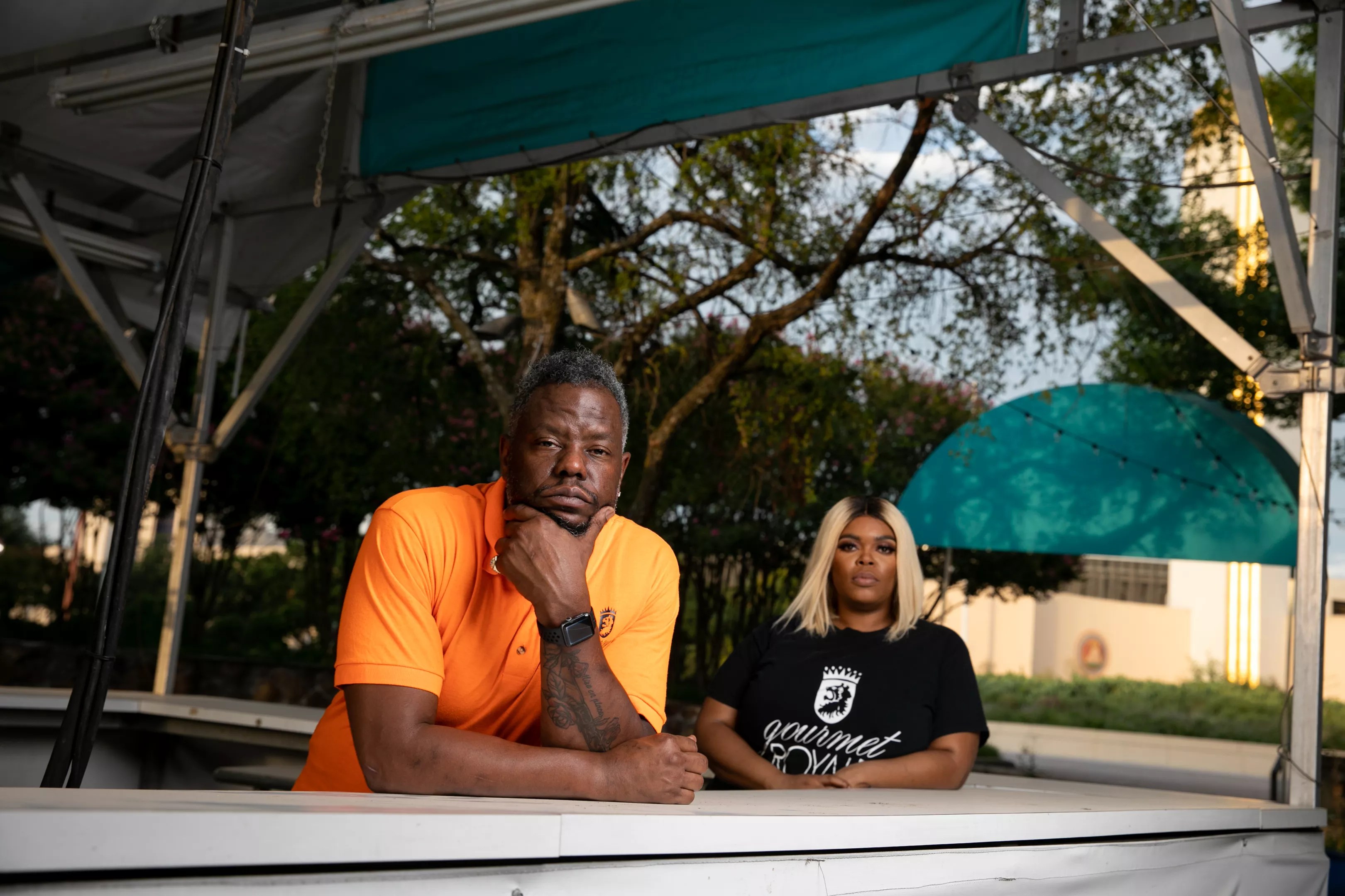Mike Davis and his wife, Gaytha, in their lot across from Fair Park that they have used for fundraising in past fair years.
