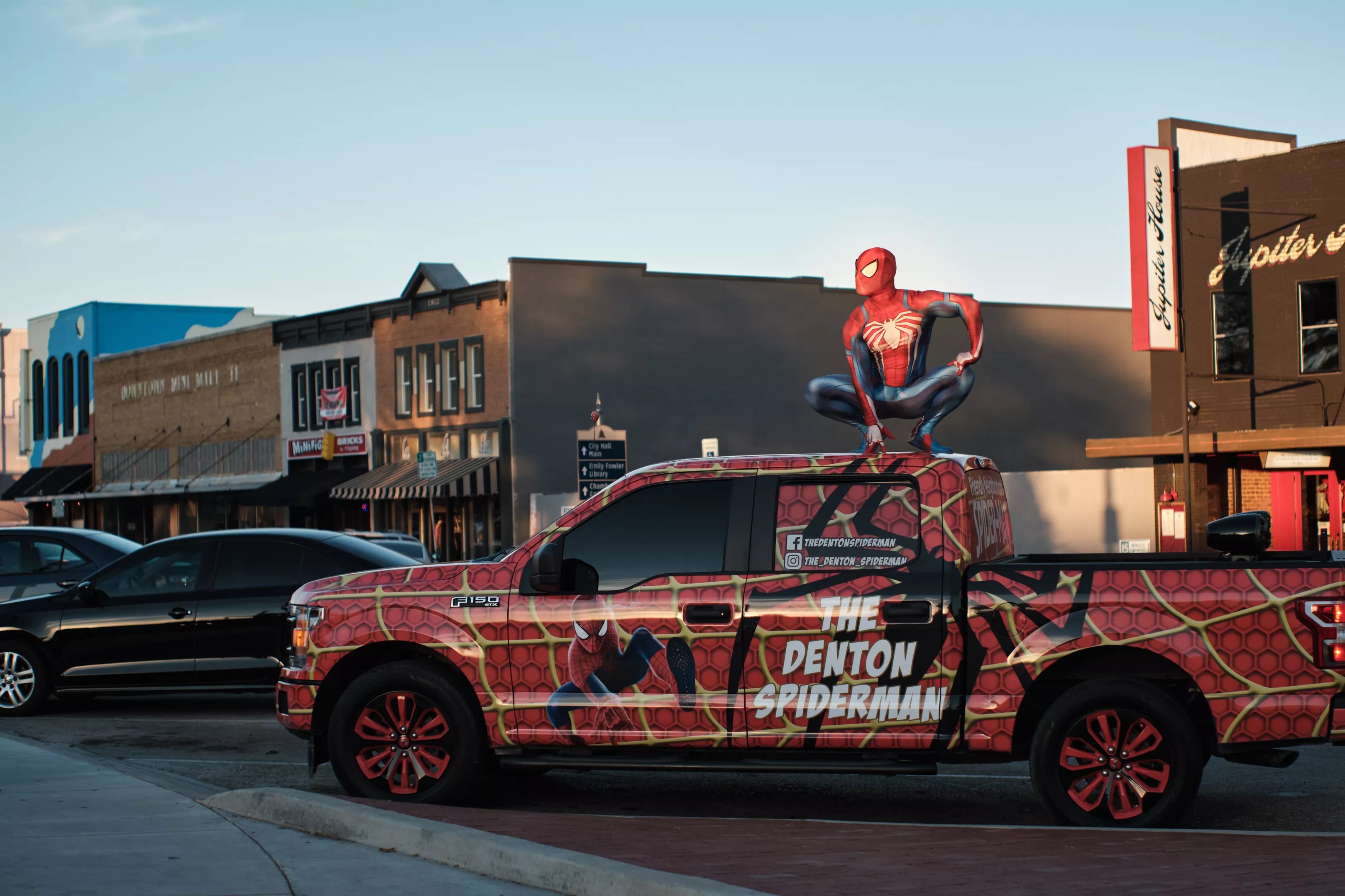 Of course, Spider-Man isn’t the real identity of Jeremy Sons, a bodybuilder and fitness coach who lives in Sanger, a small town just north of Denton. But on this brisk fall day, Sons wears a full-body Spider-Man suit while crouching atop his truck, which is also decked out in Spidey décor and bears the vanity plates: “WEBS.”