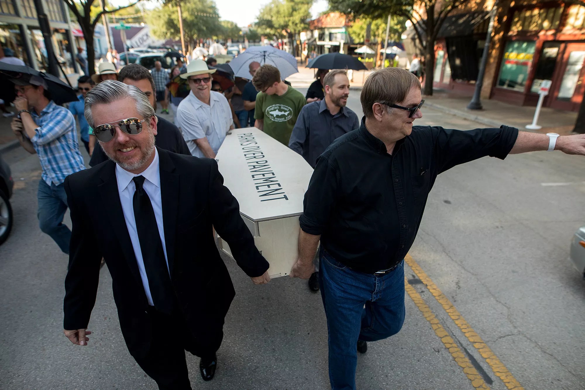 A New Orleans-style jazz funeral procession paraded through Bishop Arts on Aug. 15 to celebrate the death of controversial Trinity toll road.