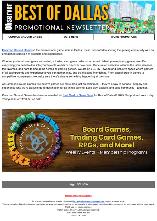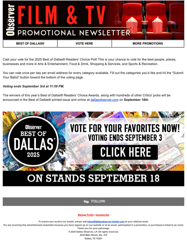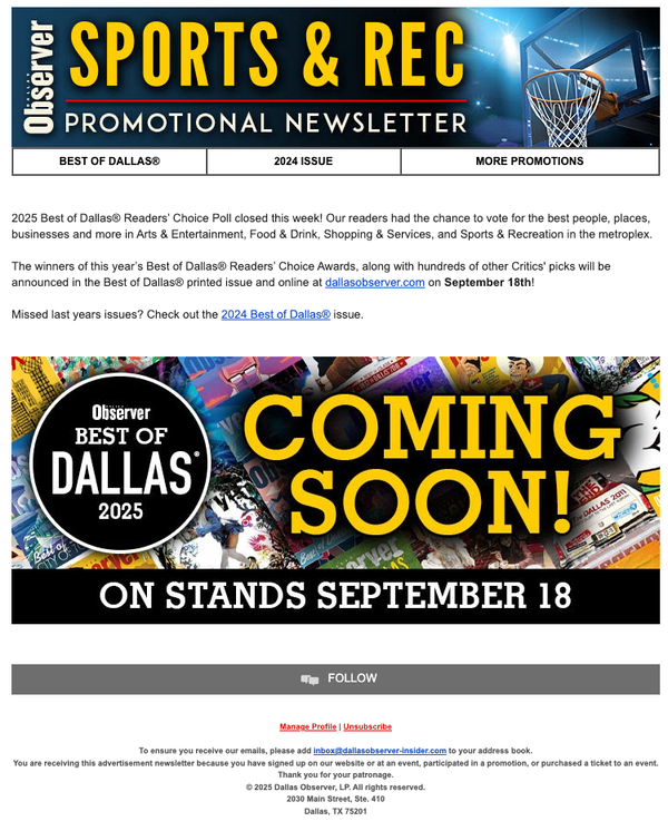 Stay informed about our Best of Dallas® winners with promotional offers and announcements from past and present title-holders. Delivered as needed Monday, Wednesday, and Friday. Once a month, we’ll also send you an editorial edition of this newsletter.